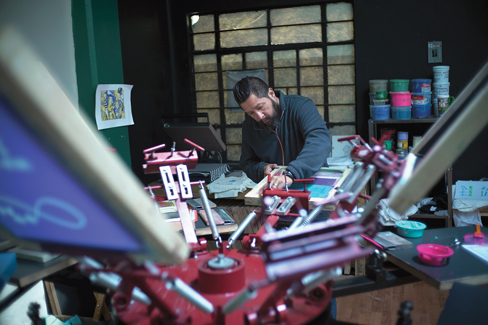 En el taller de Deportados Brand, Gustavo Lavariega, quien fue deportado del estado de Washington en 2014, está parado en la parte de atrás. Se encarga de operar “el pulpo”, un aparato de madera con el que el colectivo imprime los diseños en ropa. Lavariega nunca había utilizado una de estas máquinas antes de unirse a Deportados Unidos en la Lucha, y ahora tiene buena experiencia con su manejo.