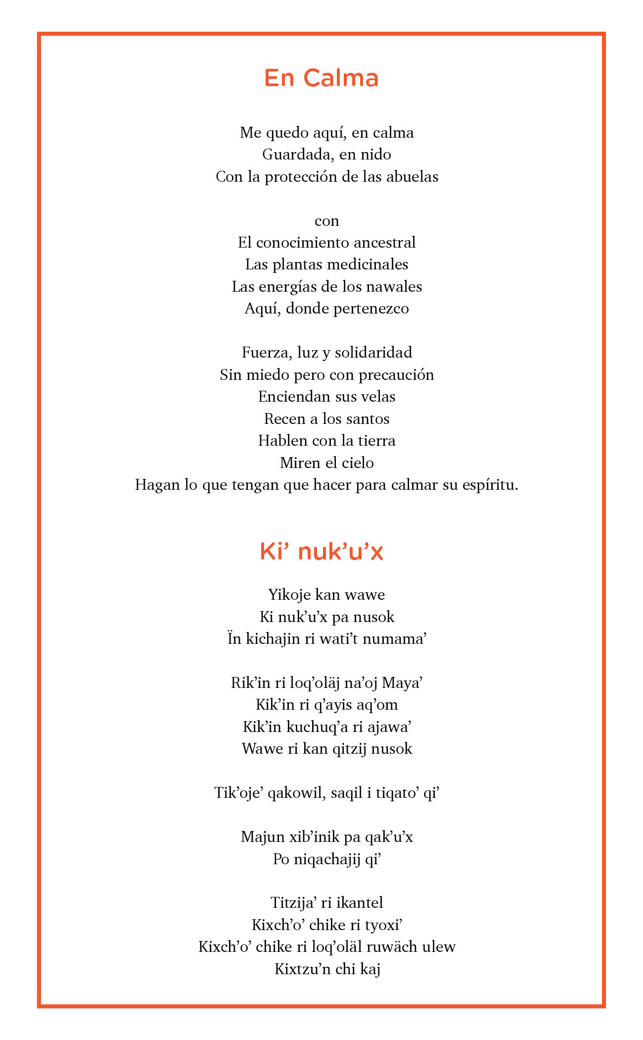 From the poet: At the moment COVID-19 was declared a global pandemic in early April 2020, I was conducting research in Guatemala, living in San Pedro el Alto, traveling to Antigua, Santa María de Jesús, and San Antonio Aguas Calientes. Public transportation stopped, my research agenda was canceled, and I had to start taking my Kaqchikel classes online. The university urged us to return to the United States as soon as possible. But, at the time, I felt safer in Guatemala and decided to stay until June. This poem alludes to the sense of community and support I felt in Guatemala amid the uncertainty. The sentiment of the poem is to trust the ancestral knowledges that live within us, the knowledges we inherit and the ones we gain throughout life. I wanted to write it in Kaqchikel because that was a way for me to honor the richness of ancestral knowledge I was exposed to while conducting research in Guatemala. For that and more, I am forever thankful to Iximulew (Guatemala), its spirit, people, and places.