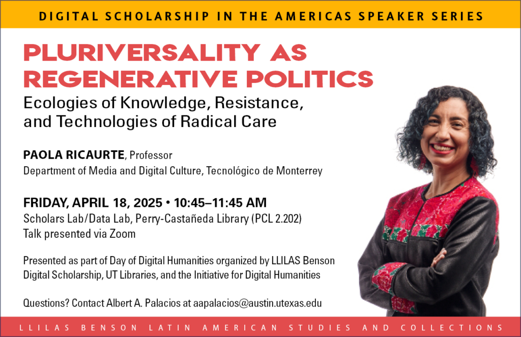 The LLILAS Benson Digital Scholarship Office continuously holds public events such as workshops and the Digital Scholarship in the Americas Speaker Series. The speaker series highlights scholars engaging in digital approaches to innovate scholarship and teaching on Latin American, U.S. Latinx, African Diaspora, and Indigenous Studies. Workshops consist of introducing and exploring various digital tools for the analysis, extraction, visualization, and sharing of information. To learn more about the specific events we have held in the past, explore the following links below.