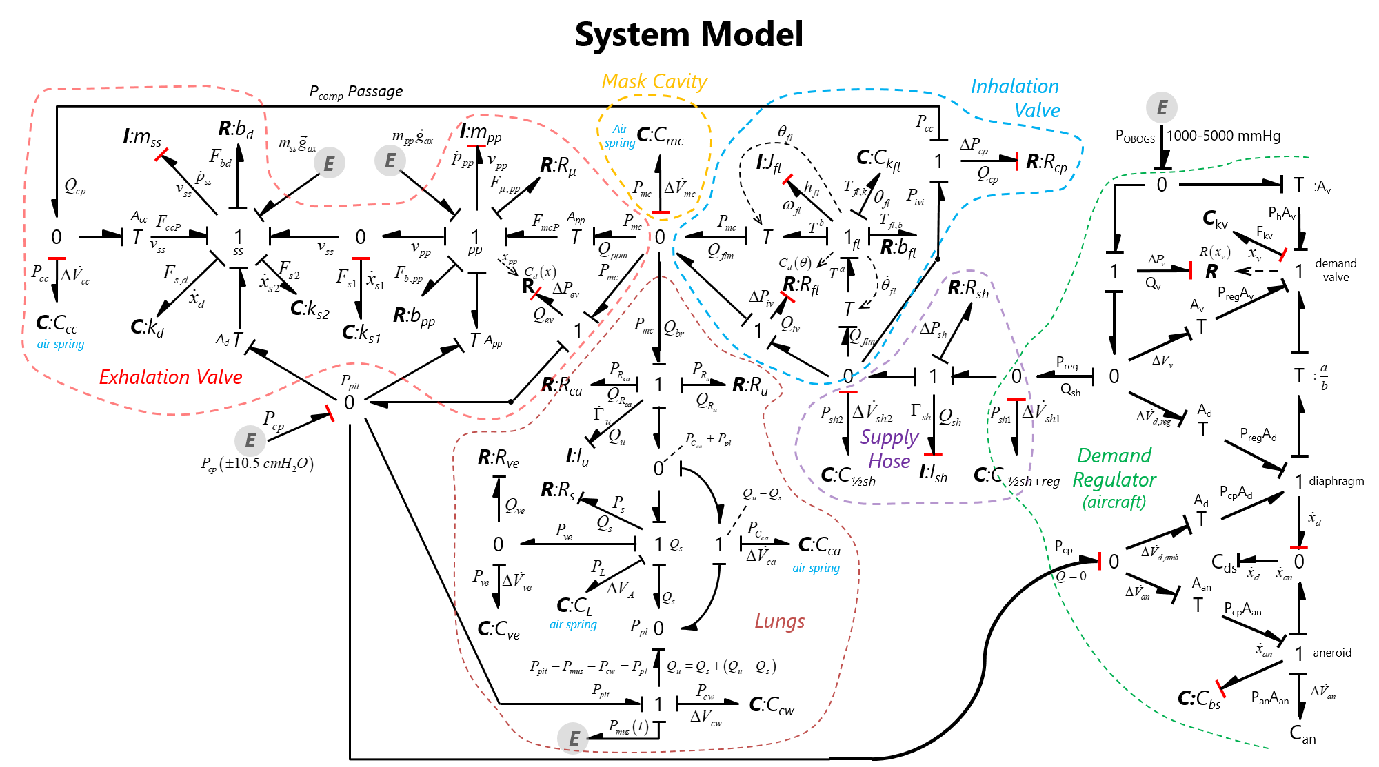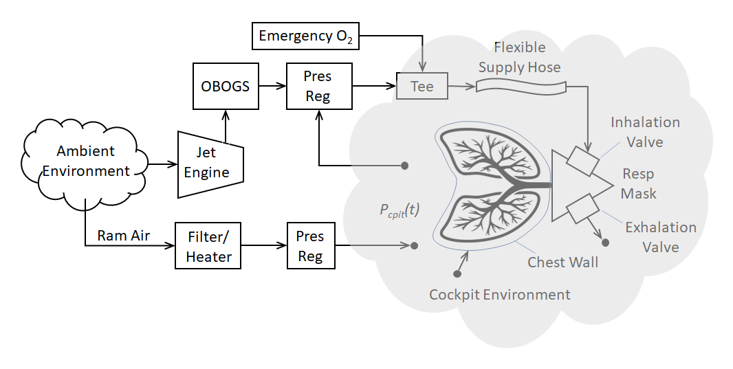 Several components are used to supply a pressurized oxygen/air mixture to pilots of high-performance military aircraft for breathing during high altitude flight. The dynamic interaction between these mechanical components must be well-matched to support the physiological needs of a pilot over a wide range of operational and environmental conditions. An additional complication is the interaction of this machine with a wide range of human respiratory system characteristics presented by the aircrew population. (e.g., various lung volume, lung tissue elasticity, diaphragm muscle elasticity, airway flow resistance, etc.). Unintended dynamic interactions between these systems could adversely affect a pilot’s breathing and be a contributing factor in the numerous reports of unexplained physiological episodes (UPEs). The complexity of these human–machine interactions and the unforgiving environment in which aircrews operate requires a unified, systematic approach to identify unintended system interactions. A model that captures the interaction between the key elements, notably the pilot’s respiratory mechanics, the physical dynamics of the mask, and any significant response characteristics of life support systems, can augment understanding of the system dynamics.