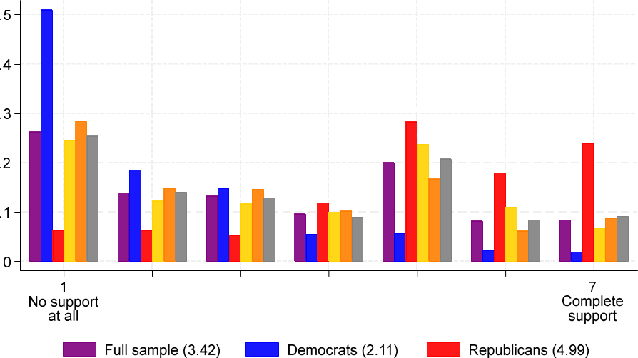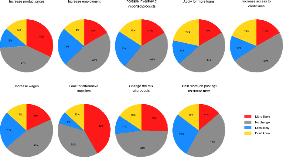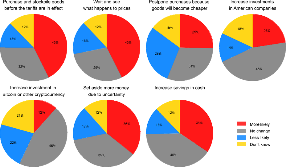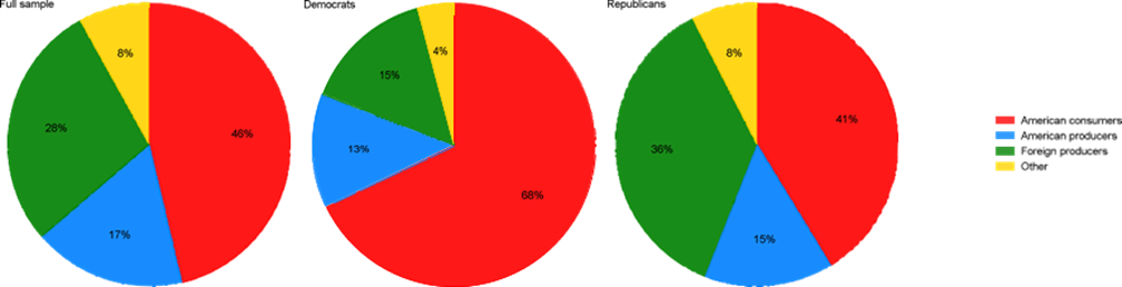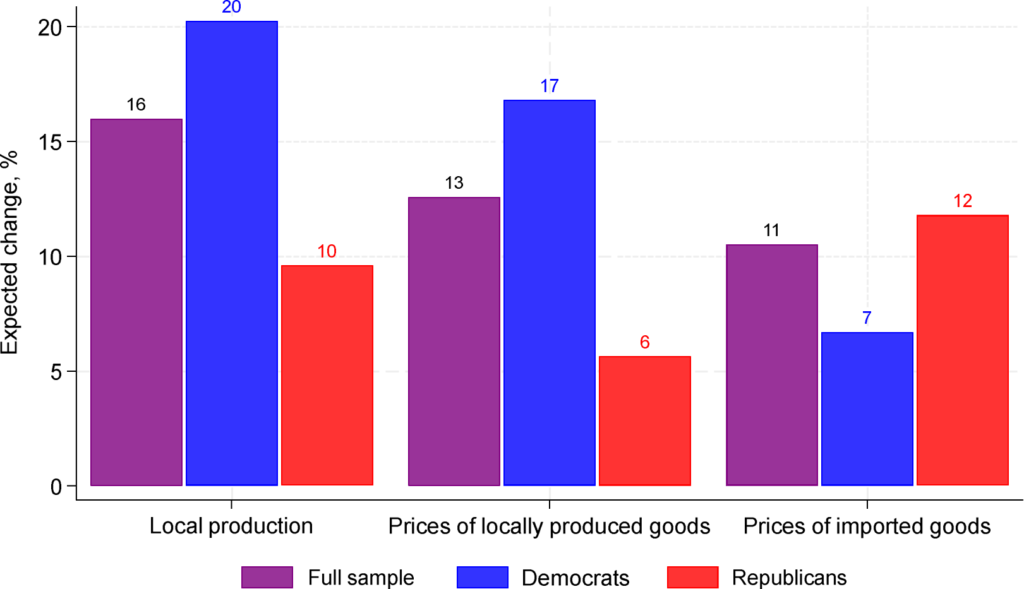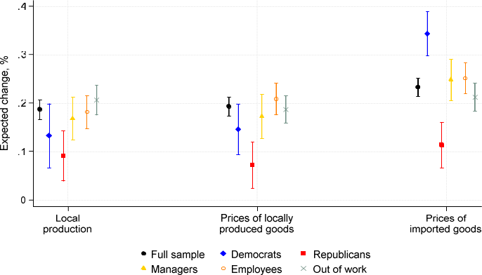 January 29, 2025, Filed Under: UncategorizedThe Upcoming Trump Tariffs: What Americans Expect and How They Are Responding By Olivier Coibion, Yuriy Gorodnichenko, and Michael WeberWith the new Trump administration, the prospect of new tariffs on our trading partners grows ever nearer. What do Americans expect that Trump will do with these tariffs and what effects do they anticipate these might have? In a recent survey, we asked Americans to tell us about what they thought would happen under Trump’s tariff policies and how this might affect their decisions. The results point toward widespread anticipation of tariffs being imposed on our trading partners, especially China, with significant expected passthrough into the prices of both imported and domestically produced goods and a general acknowledgment that American consumers will bear an important share of the cost of tariffs. In response to higher future tariffs, many Americans, and particularly Democrats, report that they would increase their purchases of foreign goods in anticipation of the upcoming tariffs and higher prices, while simultaneously trying to save more in the face of higher uncertainty about future policies. Managers report that their firms would become more likely to raise prices, change their mix of products and seek out alternative suppliers as the rise in tariffs approaches. While Republicans in our survey report positive, albeit tepid, support for these tariff policies, Democrats strongly oppose their enaction. But the divisions is not just across parties. Even within each party, there is a wide range of views about moving away from the post- WWII era of trade liberalization. The Survey Between December 13, 2024 and January 6, 2025, we fielded a survey of American consumers through Nielsen IQ. The response rate was high, around 22%, yielding approximately 13,500 responses. This is much larger than standard opinion surveys and allows to provide a much more detailed and precise view of Americans’ perceptions than is otherwise possible. The survey included a wide range of questions on respondents’ expectations about future tariffs, their consequences for the economy, and how the possibility of future tariffs is affecting their decisions. What Americans Expect the Tariffs Will Do Americans expect that the incoming Trump administration will apply heavy tariffs on our trading partners. For example, respondents expect the Trump administration will apply (on average) a tariff of 42% on Mexico and 35% on Canada, our two largest trading partners. Europe is not expected to be immune, with an expected tariff of 35% as well. The rest of the world is also not to be spared, with Americans expecting an average tariff of 39%. But the largest expected tariff by far is for China, with Americans predicting the Trump administration will apply a 50% tariff on average. Figure 1. Expected tariff by region. To understand what economic consequences Americans foresee from rising tariffs, we asked them how they expected the cost of tariffs to be allocated between American consumers, domestic firms, and foreign producers. As shown in Figure 2, respondents reported on average that they expected almost half of the cost of a hypothetical 20% tariff would be borne by American consumers, with the remaining cost split close to equally between domestic and foreign producers. But the partisan divide here is quite large: Democrats predicted that consumers would bear a significantly large share of the cost whereas Republicans expected that a larger fraction of the cost would be taken on by foreign producers. Figure 2. Who pays for tariffs? Economists typically predict that tariffs, as a tax on imports, first raise the price of imported goods, then, by reducing competition with domestic producers and by increasing the cost of imported inputs, also tend to raise the price of domestically produced products. Americans seem to agree with this prediction. As shown in Figure 3, tariffs are expected to raise the average price of imports by 11% in the next year, with the predicted effect on domestically produced goods to be even higher, at 13%. Given the size of the predicted increase in tariffs, this implies a passthrough of tariffs into domestic prices that is large: for every 10 p.p. increase in tariffs, American consumers expect 2 percent higher prices for locally-produced or imported goods. Hence, Americans expect the Trump tariffs to have pronounced inflationary effects in the near term. Both Republicans and Democrats expect the tariffs to have positive effects on the production of domestic firms. On average, they expect production to rise 17%, a very large and positive effect of tariffs. Figure 3. Expected effects of tariff increases. Figure 4 plots the predicted passthrough of tariffs into foreign and domestic prices, as well as domestic production, for different subsets of survey participants. Overall, Democrats perceive a higher passthrough of tariffs into both prices and production than do Republicans. In contrast, we see little difference in perceived passthrough based on whether respondents are managers, employees, or not working. Figure 4. Predicted Passthrough of Tariffs into Prices and Production. Notes: The estimates come from regressing expected changes in outcomes (prices, production) on expected change in tariffs (average across regions) across respondents. The markers show the point estimates of the slope and whiskers show 95% confidence intervals. How Are Americans Likely to Respond? As part of the survey, we asked respondents to tell us whether the possibility of higher tariffs could hypothetically make them more or less likely to engage in certain decisions. We report the results of this question in Figure 5. There are two key dimensions along which Americans’ actions are likely to be affected by the upcoming tariffs. First is stockpiling behavior. Over forty percent of Americans report that the possibility of tariffs would make the