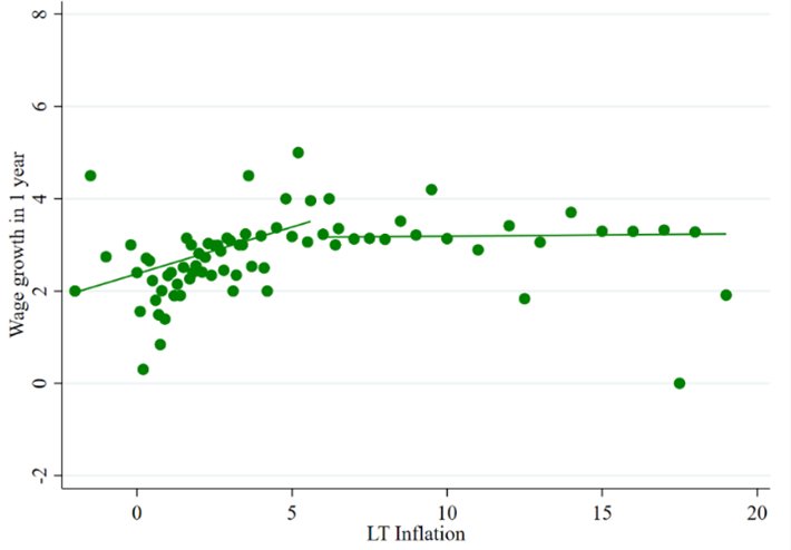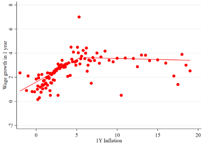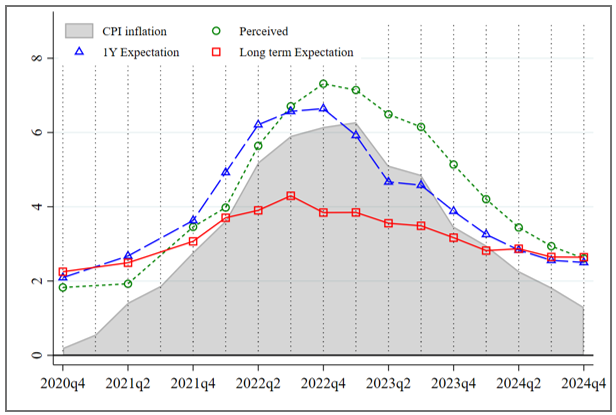 June 3, 2025, Filed Under: Blog EntryHow French Firms Navigated the Inflation Surge: Lessons for Expectations and Decision-Making By: Erwan Gautier, Frédérique Savignac, and Olivier Coibion As inflation surged across the globe in the aftermath of the COVID-19 pandemic and the war in Ukraine, economists and policymakers worried that rising inflation expectations could become entrenched and drive a wage-price spiral. While much of the attention on expectations focused on households and financial markets, relatively little was known about the expectations of firms—the agents directly responsible for setting prices and wages, due to the absence of data on their beliefs. Recent work has begun to fill this gap. Baumann et al. (2024), Abberger et al. (2024), and Candia et al. (2023), for example, have examined firms’ inflation expectations in the Euro area and the U.S., revealing both the promise and pitfalls of using survey data to better understand inflation dynamics. In a recent study, we contribute to this growing literature with a uniquely rich dataset: a quarterly survey of French firms conducted by the Banque de France between 2020 and 2024. This period covers the full cycle from low inflation to peak and back to near-target levels, offering rare insight into how inflation expectations form, evolve, and affect decisions. Furthermore, the survey includes information on firms’ beliefs about the evolution of future wages within their firm, thereby providing a unique setting to study the potential passthrough of inflation into wages. Underreaction, Overreaction, and Re-anchoring Figure 1 plots the trajectory of French firms’ perceptions and expectations of inflation at different horizons (1 year ahead for the short term, and 3 to 5 years for the long term). As inflation began rising in 2022, firms initially underreacted: their short-term expectations rose more slowly than actual inflation. But this gave way to a period of persistent overshooting—firms expected more inflation than actually materialized, especially during the disinflation phase in 2023–2024. Figure 1: Inflation expectations and perceptions Note: Average perceptions and expectations of French firms over time. Source: Banque de France survey as shown in Gautier, Savignac and Coibion (2025) This pattern—a delayed and amplified response to inflation surprises—is consistent with theories of imperfect information or rational inattention (Angeletos, Huo & Sastry, 2021). But despite this overshooting, inflation expectations gradually re-anchored by the end of 2024. Both short- and long-run expectations converged back to the ECB 2% target, suggesting that fears of a permanent de-anchoring were overstated—at least in France. Limited Scope for a Wage-Price Spiral One of the most policy-relevant questions is whether rising inflation expectations feed directly into wage-setting. Our survey provides a direct answer: firms were asked how much they expected to raise wages in the coming year. These wage expectations, while rising in 2022–2023, remained far more subdued than inflation expectations and tracked actual wage growth relatively well. Figure 2 plots the correlation between firms’ inflation expectations and their own wage expectations. Only short-term expectations (and to a lesser extent, inflation perceptions) are meaningfully correlated with expected wage growth. Long-run inflation expectations have essentially no predictive power—consistent with models where wage contracts are short-lived and expectations beyond the contract horizon are irrelevant (Werning, 2022). Figure 2: Inflation expectations versus wage expectations Note: Relationship between inflation expectations (at 1-year horizon (left-panel); 3 to 5 year horizon (right panel) and expected wage growth (1-year ahead). Source: Banque de France survey as shown in Gautier, Savignac and Coibion (2025). Moreover, we find that the pass-through of inflation expectations into wage expectations—and into actual decisions like prices or employment—was notably weaker during the high-inflation period. Why? A key factor was the emergence of firms expecting what we term an “inflation disaster”—very high inflation rates (above 10%). These firms grew more numerous in 2022–2023, but paradoxically showed less responsiveness in their behavior. Their expectations were detached from actual outcomes and from their own actions. Among firms with more moderate expectations, pass-through remained relatively stable. This pattern suggests that high inflation doesn’t necessarily amplify expectational effects across the board—if anything, it may weaken them for some firms. Expectations Matter—But Less Than Feared Taken together, our results complicate the standard narrative. Yes, inflation expectations rose. Yes, they correlate with wage and price-setting. But their power to drive actual decisions weakened during the inflation surge, especially among firms with the most pessimistic outlooks. This likely dampened the feared feedback loop of inflation expectations fueling further inflation. The French experience stands in contrast to that of other countries such as the U.S., where expectations appeared to become more sensitive to news (Weber et al., 2025) and where energy price pass-through was more direct. The French government’s efforts to shield households and firms from energy price shocks may have helped limit the unmooring of expectations (Coibion and Gorodnichenko 2025). Implications for Policymakers Our findings offer cautious reassurance to central bankers. While anchoring expectations remains crucial, not every inflation surge leads to runaway expectations or self-fulfilling dynamics. Structural features—such as wage bargaining institutions, policy interventions, and even the extent of inattention—can shape how firms respond to shocks. They also suggest that surveys of firms’ expectations are an essential complement to household or market-based m