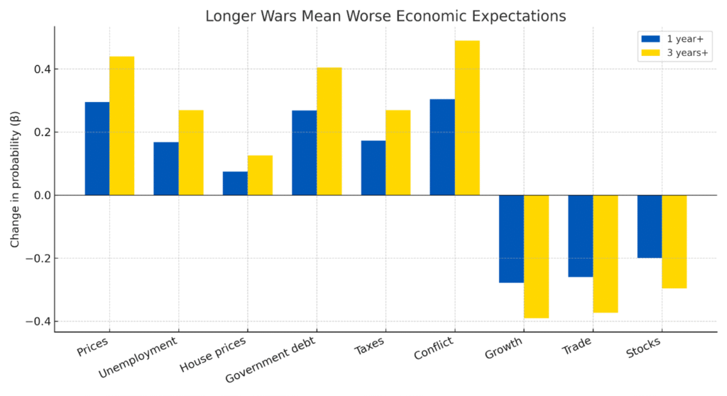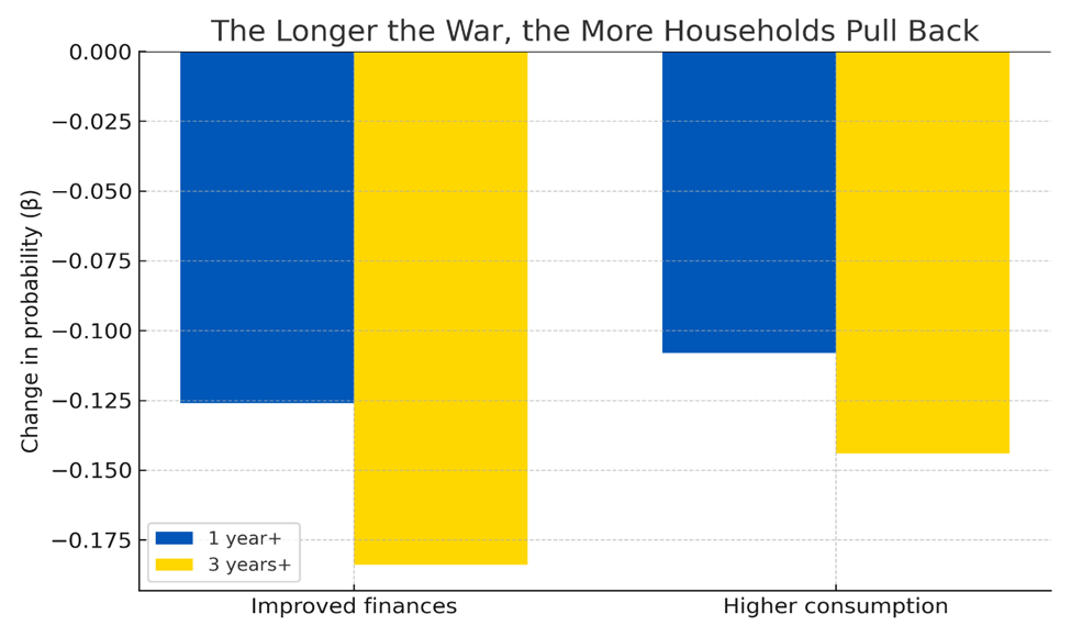 August 25, 2025, Filed Under: Blog EntryWhen Foreign Wars Abroad Hit Wallets at Home By Yuriy Gorodnichenko and Olivier Coibion What do the wars in Ukraine and the Middle East mean for your grocery bill, your savings, and your spending decisions? For most of us, they feel like tragedies happening far away. But new evidence shows they reach into our households in subtle yet powerful ways — by reshaping how people view the economic future. The Hidden Front Wars don’t just destroy cities and lives where they are fought. They also ripple outward, creating uncertainty in energy markets, disrupting global trade, and rattling financial markets. That much is obvious. What’s less obvious is how they change the way ordinary consumers think about the economy — and therefore how they behave. When people fear the future will be worse, they spend less today. And when millions of households do this at once, recessions can follow. Economists have long suspected this. The Gulf War coincided with the 1990–91 U.S. recession, as consumer confidence fell sharply. After the Brexit referendum, U.K. households pulled back spending. And when Russian tanks rolled into Ukraine in 2022, European confidence indicators plunged. But were those just correlations, or did the wars cause people to spend less? That’s the question my co-authors and I set out to answer. Running a Thought Experiment at Scale Together with colleagues at the European Central Bank, we fielded a large-scale survey of euro-area households. We couldn’t randomly assign people to live in a world with or without war. But we could do the next best thing: randomize how long respondents were told the current wars might last. Some were told the conflicts would end within months. Others were told they might drag on for years. Then we asked how they thought that scenario would affect prices, growth, stock markets, government debt, their own financial situation, and their spending. Because the scenarios were randomly assigned, differences in responses capture the causal effect of perceived geopolitical risk. The results were striking. A Stagflationary Future When people imagine a longer war, their expectations shift sharply. They expect higher inflation. They expect lower growth. They expect rising unemployment. They expect falling stock prices and weaker trade. They expect governments to pile up debt and raise taxes. In other words: prolonged geopolitical risk looks stagflationary to households. Figure 1 (adapted from our paper’s Figure 3) shows this clearly: the longer the expected conflict, the darker the collective outlook. From National Outlook to Personal Wallets But this isn’t just about “the economy.” People also bring it home. Asked about their own financial situation, households facing the “long war” scenario were much more likely to say they’d be worse off. That pessimism translated into expected cuts in spending — especially on big-ticket items like appliances, cars, or vacations. Using panel data from the survey, we can actually see the same households spending less when their geopolitical concerns rise. On average, a modest increase in geopolitical worries led to a nearly 1% drop in nondurable spending (food, clothing, etc.) and a 4–5% drop in durable spending (furniture, electronics, cars). Figure 2 (adapted from our paper’s Figure 4) shows how consumption expectations fall as the expected duration of war rises. What This Means for the U.S. Although our data come from Europe, the lessons extend across the Atlantic. American consumers also react strongly to geopolitical shocks. After Iraq invaded Kuwait in 1990, U.S. consumer confidence collapsed, helping tip the economy into recession. More recently, spikes in geopolitical risk indexes have coincided with jumps in gas prices and drops in consumer sentiment in the U.S. The timing matters. The United States is already in what looks uncomfortably close to a stagflationary environment: growth has slowed, productivity is weak, while inflation remains above target. Wars abroad that reinforce these stagflationary expectations — higher prices, lower growth — can make an already delicate balance much harder to manage. This is where central bank independence comes in. If households start doubting that the Federal Reserve will be able — or willing — to keep inflation in check when geopolitical shocks hit, expectations can become unanchored. And once inflation expectations drift upward, they feed into wage demands, pricing decisions, and borrowing costs, making stagflation more entrenched. The Danger of Normalizing Crisis One lesson from our findings is that uncertainty fatigue can have real costs. If consumers come to see endless war as the “new normal,” their lower spending could become self-fulfilling, dragging down economies already strained by climate change, technological upheaval, and populist politics. That may help explain why leaders like Christine Lagarde of the ECB warned early on that “a long-lasting war in Ukraine remains a significant risk” for European confidence. She was right — not just politically, but economically. And the same message should resonate in Washington: foreign policy doesn’t just shape geopolitics. It shapes Main Street wallets, and it tests whether central banks can maintain credibility in the face of political pressure. What To Do About It Policymakers can’t stop wars on their own. But they can mitigate how wars shape expectations. Clear communication about energy security, fiscal discipline, and long-term resilience can help counter the drumbeat of pessimism. So can targeted transfers to households most vulnerable to shocks. For central banks, the challenge is sharper: to remain committed to price stability even when geopolitical risks push growth lower. That is precisely why central bank independence is so critical. If monetary policy bends too easily to short-term political pressures in the face of stagflationar