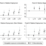 March 5, 2025, Filed Under: Blog EntrySkill Specificity and the Pace of Technological Change: Lessons from History By Rodrigo Adão (Chicago Booth), Martin Beraja (UC Berkeley Haas), and Nitya Pandalai-Nayar (UT Austin) As artificial intelligence reshapes the workplace, policymakers and business leaders are confronted with a pivotal question: how quickly will workers adapt to AI-driven changes? To understand what shapes these transition speeds, in a recent paper Adão et al. (2024), we examine two major technological revolutions of the past century: the manufacturing innovations of the early 1900s and the emergence of Information & Communications Technology (ICT) from the 1980s onward. We find that the skill requirements of new technologies critically determine how quickly economies adapt. The adjustment was faster for manufacturing because it required skills more similar to existing occupations, whereas the ICT revolution required different skill sets, resulting in a slower transition. While older workers found it challenging to transition into ICT-intensive occupations, younger generations gradually filled these roles. Comparing Technological Shifts Historically, innovations such as steam engines, electricity, and computers have led to fundamental shifts in economic activity. Looking to the future, artificial intelligence and robotics promise similar transformative impacts. When innovations favor specific skills, inequality may rise rapidly (Katz and Murphy, 1992). The reorganization of labor markets might take decades as workers shift roles and newer generations acquire necessary skills (Chari and Hopenhayn, 1991). But do economies adjust at different paces depending on technology? The literature mainly explains common patterns across adjustment episodes rather than examining how specific technologies shape them (Helpman, 1998; Herrendorf et al., 2014). We present new insights into how exposure to technological innovations affected employment and wages across different occupations in the U.S. during two eras: the manufacturing-enhancing technologies of the early 20th century and the ICT innovations later that century. The contrast between these historical episodes is striking. Panel A of Figure 1 shows that the relative employment growth in more exposed occupations was both faster and stronger overall following the manufacturing innovations of the early 1900s compared to the ICT innovations of the late twentieth century. When assembly lines and electrical machinery transformed manufacturing in the early 20th century, workers rapidly shifted into manufacturing-intensive occupations. Panel B indicates a quick surge in demand for ICT-intensive occupations between 1980 and 1990, with a corresponding labor supply response after 2000. Figure 1 Panels C and D of Figure 1 depict the employment response for older and younger workers, respectively. The ICT expansion post-1980 was almost solely driven by younger workers, as older workers did not shift to ICT roles—the black dots in Panel C show negligible and statistically insignificant changes for seasoned workers. However, the black dots in Panel D illustrate a significant increase in young workers entering ICT roles over forty years. Overall, the data indicate that the labor supply adjustment to ICT innovations was limited and delayed due to the minimal reallocation of older generation. The Role of Skill Specificity What explains these contrasting patterns? Our research shows that a key factor is how different the required skills are between old and new jobs – what we call “skill specificity.” When new technologies demand skills that differ from those used in existing jobs, the transition tends to be slower and more reliant on new generations entering the workforce. Figure 2 To investigate this, we develop systematic measures of skill similarity between occupations. Figure 2 depicts two histograms, one for each episode, showing the task distance measure across occupations. The task distance distribution for ICT exposure in the latter episode has more mass on higher distance values than the distribution for manufacturing exposure in the earlier episode. For instance, the analytical and programming skills needed in software development had limited overlap with most existing jobs in 1980. This high skill specificity made it difficult for experienced workers to transition into ICT roles. In contrast, manufacturing jobs in the early 1900s required skills more similar to existing occupations. A craftsman could more readily adapt his manual and technical abilities to operate new industrial machinery. This lower skill specificity enabled the faster reallocation of incumbent workers. Dynamics of Adjustment The degree of skill specificity shapes transition dynamics through two key channels: First, when skills are more specific, experienced workers find it harder to switch to new occupations, even when wages are higher. This creates a direct barrier to workforce reallocation. Second, this limited mobility of incumbent workers leads to higher wage premiums in new occupations. These wage increases provide strong incentives for young workers entering the labor force to invest in new skills. This explains why technological transitions with high skill specificity are driven primarily by new generations. We develop a theoretical model that formalizes these mechanisms and demonstrates how they can quantitatively account for the different adjustment patterns observed in the manufacturing and ICT transitions. Implications for the AI Revolution Our findings have important implications for how economies might adapt to artificial intelligence. Early evidence suggests that some AI applications, like large language models, may be relatively easy to use with existing skills. As discussed in Acemoglu et al. (2023), AI could augment rather than replace current capabilities, suggesting a potentially faster adaptation than during the ICT revolution. However, more 