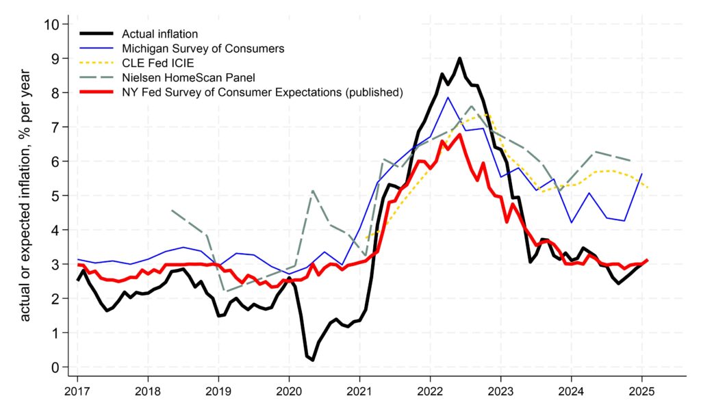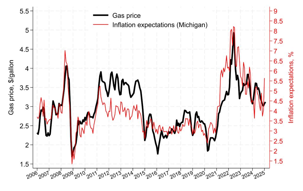 April 28, 2025, Filed Under: Blog EntryWhat’s happening with inflation expectations? By: Yuriy Gorodnichenko and Olivier Coibion Economic policymakers spend a lot of time dissecting different measures of inflation expectations in the economy, since these affect prices, wages, consumption and many other outcomes. Over the last year or so, a major gap has appeared between two of the leading surveys of U.S. consumers’ inflation expectations: the New York Federal Reserve’s Survey of Consumption Expectations (SCE) and the Michigan Survey of Consumers (MSC). The latter displays high levels of expected inflation since the inflation surge whereas the former reports low “anchored” levels, as shown in Figure 1. Which is correct? The answer is the Michigan survey. Figure 1: Surveys of Household 1-Year Ahead Inflation Expectations How do we know this? We use two strategies. The first is to bring in other surveys of consumer expectations to determine whether it is the MSC or the SCE that is the outlier. The second is to dig into the surveys to understand why they seem to point to different answers. Both approaches lead us to the same conclusion. Other surveys of inflation expectations of households confirm the Michigan survey. Figure 1 plots results from surveys of Nielsen Homescan panels we run every quarter, covering around 20,000 representative households per quarter (much larger than Michigan or NY Fed). It also plots the Indirect Consumer Inflation Expectations survey from the Cleveland Fed. Both give approximately the same dynamics as Michigan. What is clear from this figure is that it is the reported data from the NY Fed survey that is the outlier, not the Michigan survey. The NY Fed applies different methodological choices: The NY Fed survey results reported in Figure 1 are different from those of the other surveys in three ways, each of which we think is a problem. a. Medians vs means: The NY Fed series is for the median instead of the mean: this throws away all the information in the right tail, which is where the action is when it comes to inflation expectations. The mean is more volatile but the resulting volatility is not noise. See Figure 2 for example: most of the high-frequency variation in mean forecasts is associated with gasoline (oil) price variation that consumers observe. We should not be throwing away this information by relying on the median. Since the NY Fed provides individual-level responses prior to the last 12 months, we can easily construct the mean, with the exception of the most recent data. Figure 2: Household Inflation Expectations and Gasoline Prices b. Distribution questions vs point forecasts: Whereas the other surveys use point forecasts, the NY Fed presents responses from a “distribution” question where respondents assign probabilities to a pre-defined set of possible outcomes. This induces framing effects (it’s centered around zero) and introduces a bias as the inflation rate rises (because the bins are fixed). Fortunately, the NY Fed also asks respondents for point forecasts, so this is easy to address. c. Panel conditioning effects: The NY Fed has respondents participate every month for a year. This is a problem because people learn from participating in the survey: their responses in the wave are usually ~2p.p. higher than in their third wave (Kim and Binder 2023). In other words, after the first wave, they are no longer representative and should not be used. Since the NY Fed provides individual data with information about how many times they have participated (albeit with a one-year delay), we can easily address this issue by focusing on the subset of respondents who are responding for the first time. If we correct for these three differences using the NY Fed micro-data, we get the results in Figure 3 below, which mirror what we get from the other surveys. In other words, the surveys actually all tell the same message: year-ahead inflation expectations are currently around 5-6%. The same logic applies to LR expectations: you should rely on mean 5-year ahead expectations of the Michigan survey, and these are currently very high and unambiguously unanchored. Figure 3: Uncorrected and Corrected NY Fed Survey Expectations Conclusion: Expectations of households and firms, following the inflation surge, have settled at new higher levels after the surge than they were prior to the surge. This suggests that the inflation surge experience has further unanchored their expectations. Since these feed into consumer spending as well as firms’ pricing, employment and investment decisions, we should expect inflationary pressures to be particularly high, complicating the job of achieving the “last mile” of inflation reduction and responding to new inflationary pressures from tariff policies.