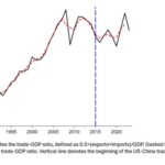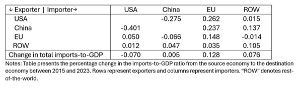 April 18, 2025, Filed Under: Blog EntryThe Economics of Trade Bloc Formation: Who Wins from Decoupling? By: Barthélémy Bonadio, Zhen Huo, Elliot Kang, Andrei A. Levchenko, Nitya Pandalai-Nayar, and Hiroshi Toma Related Working Paper: Playing with blocs: Quantifying decoupling As geopolitical tensions rise between major powers, concerns intensify over the economic implications of trade fragmentation. Policymakers worldwide are concerned that the US-China trade war, Brexit, and the breakdown of economic ties between the West and Russia are all signs of a hazardous trend toward “deglobalization.” Yet despite these challenges, global trade remained surprisingly resilient. A recent paper, Bonadio et al. (2024), presents new evidence that during this period, the global trading system reconfigured itself into distinct blocs. The authors find that, contrary to popular belief, this realignment prior to 2024 did not result in significant welfare losses. In contrast, the 2025 US tariff increases and retaliation by trade partners announced as of mid-April, are likely to raise trade barriers both within and across the pre-2024 blocs, potentially reducing welfare. Figure 1: World Trade / GDP Ratio The Rise of Trade Blocs The post-2016 era has been marked by significant policy shifts that potentially threaten international trade, such as the Brexit vote, the US-China trade war, and more recently, Russia’s invasion of Ukraine and subsequent sanctions. These events have sparked concerns about the possible unraveling of globalization.However, an analysis of global trade data shows that trade relative to economic activity has not decreased since the onset of these shocks (Figure 1). In fact, the ratio of world trade to GDP has partially reversed the downward trend that started following the Global Financial Crisis.What explains this resilience? As Antràs (2020) and Goldberg and Reed (2023) have documented, we are not experiencing deglobalization but rather fragmentation or decoupling – a reconfiguration of trade links across the globe. As countries involved in trade conflicts disengage from each other, they ramp up trade with other partners. Table 1 confirms this pattern: even as trade between the US and China fell, both economies increased trade with the rest of the world.Table 1: Change in Trade (2015-2023) Measuring Bloc Formation and Its Economic Impact Our research employs a data-driven approach to identify which countries are aligning into which trade blocs. Using bilateral trade data from 2015 to 2023, we identify decoupling patterns and quantify their economic impacts. We categorize countries into three groups: 1) The US bloc, consisting of countries that experienced reduced trade costs with the US and increased trade costs with China, 2) The China bloc, comprising countries with heightened trade costs with the US and decreased trade costs with China, and 3) Unaligned countries, where trade costs with both the US and China moved in the same direction[PT1] . We identify revealed trade costs from observed trade flows, by running a standard gravity equation. The residual of this equation is then revealed bilateral trade costs, up to the trade elasticity. Our approach, based on observed trade flows, contrasts to alternatives where the bloc structure is imposed on the data using observations like U.N voting patterns. In our analysis of 187 countries, we find that roughly one-quarter of countries have aligned with the US, another quarter with China, and about half remain unaligned. Russia, Saudi Arabia, Israel, and Hong Kong are clearly aligned with China, while European countries, along with India, Korea, Japan, and Singapore, are part of the US bloc. Surprising Consequences from Decoupling Utilizing a quantitative multi-country, multi-sector global production network model, we evaluate the economic effects of observed changes in trade costs. Contrary to the widespread belief that fragmentation reduces welfare, our findings indicate that the median country experienced a marginal increase in real income from trade cost changes between 2015 and 2023, 0.6% respectively. Thus, the process of decoupling has not yet diminished global GDP . As expected, nonaligned countries see larger income changes (0.8%) compared to those aligned with the US or China, since they do not consistently face increased trade costs with either bloc . However, even countries within the US and China blocs generally experience small gains in real income due to trade cost changes. This finding stems from the fact that global trade remained quite stable relative to global activity from 2015 to 2023. Lower trade flows between some countries (such as the US and China) were more than compensated by higher trade flows between others. In other words, trade data reveal no significant rise in trade costs on average, which explains the lack of a negative impact on average real GDP. Are Countries in the “Right” Blocs? According to the factual simulation above, most countries are not worse off in the fragmented world, as trade costs decreases within blocs more than offset trade cost increases across blocs. A natural question arises: are countries aligning with blocs based on the benefits arising from international trade? To answer this question, we conduct counterfactual exercises where we shift countries to different blocs and compare their outcomes to the baseline. Our counterfactual analysis examines whether countries would benefit economically from changing bloc alignment. Surprisingly, we find that economic self-interest does not fully account for current bloc formations. The median country in the US bloc would benefit from switching to the China bloc, and vice versa. This suggests that geopolitical factors, rather than purely economic considerations, are influencing bloc alignment decisions. By investigating the determinants of trade changes, we find that geopolitical considerations indeed increased their role in internationa