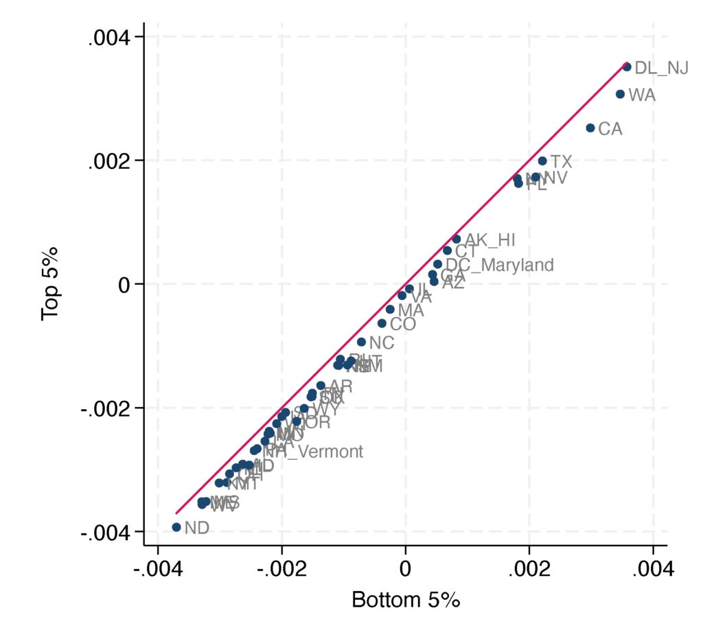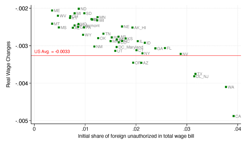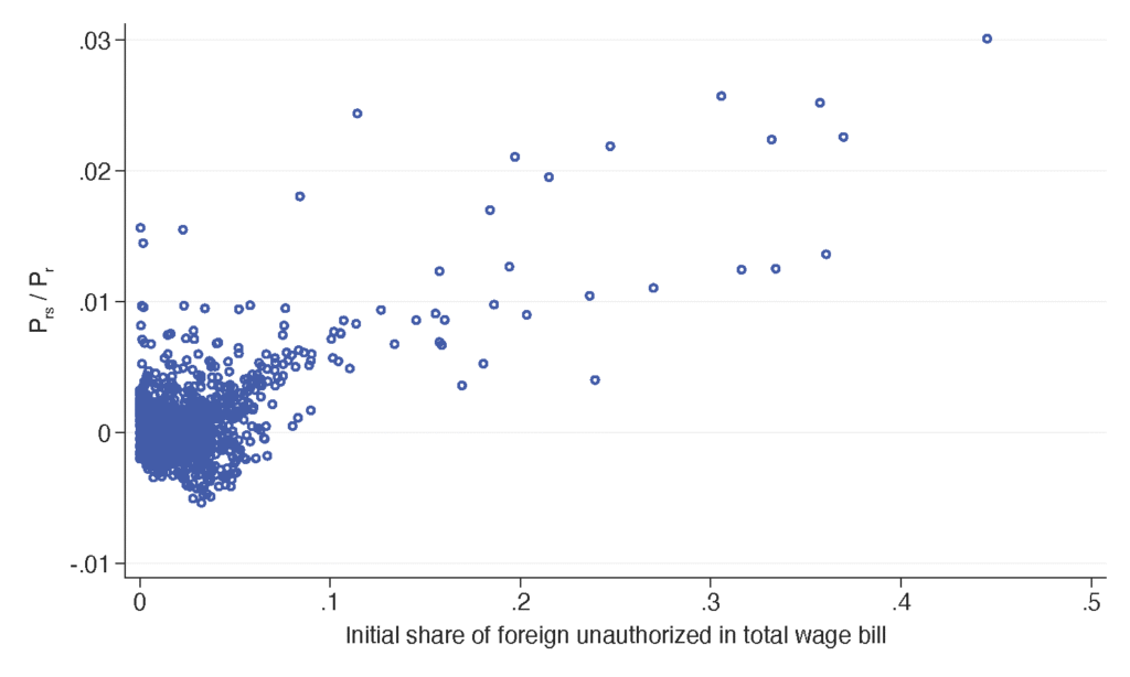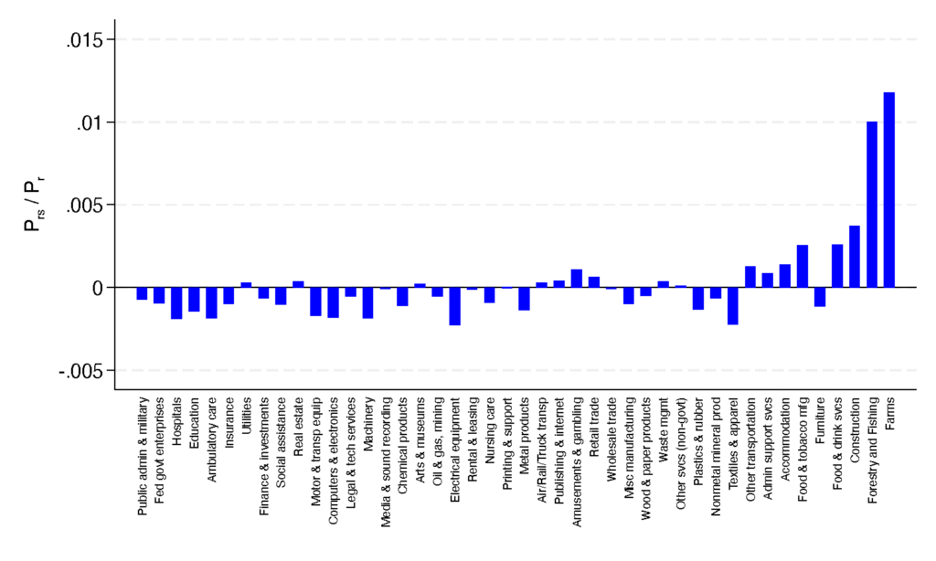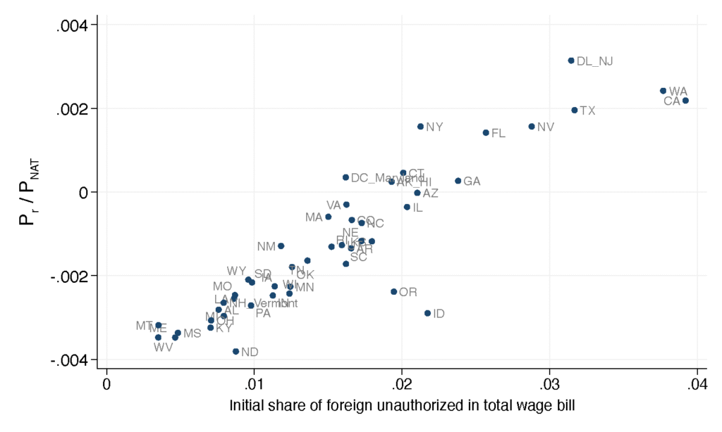 September 9, 2025, Filed Under: Blog EntryThe Economic Ripple Effects of Mass Deportations By Javier Cravino, Andrei A. Levchenko, Francesc Ortega and Nitya Pandalai-Nayar The U.S. is in the midst of an unprecedented wave of deportations. Between January and July 2025, nearly 150,000 individuals were deported, and the provision of a total of $170 billion in new federal funding for immigration enforcement suggests these efforts will continue. This raises several key economic questions and concerns: How will this policy reshape the economy? Will consumer prices of everyday items such as food soar? Will American workers benefit? In new research, we quantify the economic consequences of large-scale deportations using fresh data on workers’ legal status combined with a rich, multi-region, multi-sector quantitative model of the U.S. economy with heterogeneous workers. Where unauthorized workers are concentrated We use a novel algorithm to impute the legal status of foreign-born workers in the American Community Survey (ACS). Importantly, our approach accounts for migrant arrivals in 2024, and distinguishes between workers with temporary work authorizations (TPS, DACA, parole, asylum seekers), and workers fully unauthorized to live and work in the US. Our analysis focuses on this latter group only, though our model can be used to study other policies affecting the temporary work authorization group as well. Unauthorized immigrants make up about 3% of the U.S. workforce, but their presence is far from uniform: By state: California, Texas, Nevada, New Jersey, Washington and Florida each have around 5–6% of their workforces unauthorized. In contrast, states like Montana and West Virginia have negligible shares. By industry: Farming stands out, with more than one-third of workers unauthorized. Construction, Food & Drink Services, and Forestry & Fishing also rely heavily on this labor. By occupation: Farmers, construction workers, and personal service providers (such as cleaning and yard work) have some of the highest shares of unauthorized workers. Figure 1: (adapted from Figures 1,2 and 3 of our paper) Shares of unauthorized workers across states, industries, and occupations. States Industries Occupations What happens when deportations rise? Using a stylized version of our model, we show analytically that native workers’ (US born and naturalized citizens’) average real wages fall in all regions in response to deportation shocks. Analytically, the fall is in proportion to the initial presence of unauthorized workers in the geographic location. However, despite this overall decline, native wages in some immigrant-intensive occupations may increase if native and foreign-born workers are sufficiently substitutable. Finally, the removal of unauthorized workers raises the relative prices of immigrant-intensive sectors, in proportion to how much labor these sectors use in producing output, and to the share of unauthorized workers in these sectors’ wage bills. We then calibrate our full model with standard parameter estimates. We match the shares of native, authorized and unauthorized workers across states, sectors and occupations, as well as national sectoral expenditures and intra-region and international trade flows. We simulate the removal of 50% of unauthorized workers nationwide – about 1.5% of the workforce. While the shock is aggregate, the impact is heterogeneous across regions, sectors and occupations, as the distribution of unauthorized workers varies at this granular level. The results validate our analytical results, and challenge some conventional expectations: Native workers lose overall, but average real wage declines are modest We find average real wages for natives fall by 0.3% nationally and fall in every state. The declines are steepest in California, Washington, New Jersey, and Texas (−0.4 to −0.5%). But, as predicted by the theory, not all natives lose: those in immigrant-heavy jobs, like farming, see wage increases of as much as 3–7%. Figure 2: (adapted from Figure 4 of our paper) Native wage changes by state and occupation. Immigrant workers gain Authorized immigrants experience a 3% increase in real wages. Unauthorized immigrants who remain in the country see the biggest gains—12% on average— due to their relative scarcity and low occupational substitutability with other categories of workers. Prices rise in certain sectors, but modestly in most Sectors most exposed to the shock see modest price increases. For instance, farm goods become 1.6% more expensive relative to the overall price index. Forestry & Fishing see similar increases, while most other sectors show little change. Consumer prices overall rise by less than producer prices, as intra and international trade and substitution towards less affected regions cushions the consumer price impact. Figure 3: (adapted from Figure 6 of our paper) Producer and consumer price changes by sector. Who bears the burden? We find the cost-of-living impact is uneven. States with larger shares of unauthorized workers (California, Washington, Texas, New Jersey, Florida) face consumer prices 0.2–0.3% above the national average, while states with minimal exposure (North Dakota, West Virginia) see relative price declines. The gap between the most and least exposed states is around 0.7%. It is well known that lower-income households have larger expenditure shares on staples like food items, which are sectors seeing relatively larger price increases from the policy. As expected, looking across households, deportations are slightly regressive. Lower-income households—who spend a larger share on food—face somewhat higher price increases than wealthy households. Yet the gap is limited: just 0.02 percentage points between the bottom and top 5% of earners. This reflects both the size of relative consumer price increases by sector: the most affected sectors see modest price increases, and the insufficiently large gap in expe