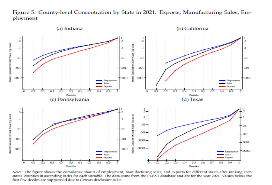 November 26, 2025, Filed Under: Blog EntryMeasuring Local Participation in Global Markets: Introducing the PLEXT Dataset By Christoph E. Boehm What are the effects of the recent increase in Chinese import tariffs on exports from Texas? How do these tariffs impact workers in cities like Austin, Dallas, or Houston? And is there hope that the goods once destined for Chinese markets can instead be sold to other foreign trading partners with whom Texan firms already maintain established relationships? These are the kinds of questions that, until recently, were challenging to answer with the U.S. trade data available. The problem lies in the fact that data on U.S. exports and imports is collected at the firm level. Because most exporting firms are large and often operate plants across multiple regions of the country, it is difficult to determine where the production of exported goods takes place and where the workers involved are employed. This lack of geographic detail leaves policymakers in the dark about where the benefits of trade accrue and where the risks associated with fluctuations in foreign demand are concentrated. Recent work by Boehm, Flaaen, Pandalai-Nayar, and Schlupp aims to address this shortcoming. The researchers assembled a new dataset that makes it possible to accurately answer questions like those raised above. The idea behind this data resource—available with approved proposals through Census Research Data Centres—is to combine existing firm-level trade data with additional information on where firms operate plants, which products those plants produce, as well as related details, thereby allowing trade transactions to be linked to individual plants within each firm where the product being exported was likely produced. The result is a new dataset that reports trade transactions—including export values, product codes, destination countries, quantity measures, and more—at the plant level for the first time. This dataset, called the PLEXT data (for plant-level export transactions), also enables measurement of exports at various geographic levels, since plants have address information. For example, one can aggregate exports from all plants located in a given ZIP code, county, commuting zone, or state. As a result, the dataset can be used to answer questions of the sort raised above, for instance, how workers in Austin, Dallas, or Houston were affected by tariff changes. The authors also examine the properties of the new data. A striking finding they document is that exports in the United States are extremely concentrated geographically (see Figure 1, Figure 5 in the paper). In Texas, for example, more than 96 percent of exports in 2021 came from just 10 percent of counties. This pattern contrasts with the distribution of manufacturing sales and employment, which are also geographically concentrated but to a lesser degree. In Texas, the top 10 percent of counties account for roughly 85 percent of manufacturing sales and about 82 percent of manufacturing employment. Figure 1: Variation in concentration of employment, sales and exports of establishments for selected states This high degree of concentration implies that certain areas of the United States benefit enormously from access to foreign markets. For example, exports per worker in the combined metropolitan areas of El Paso, TX, and Las Cruces, NM, exceeded 35,000 dollars to Mexico alone—an indication of the substantial gains these regions derive from access to the Mexican market. While geographic proximity helps explain this particular case, exports per worker to other countries are also significant in various parts of the U.S. The combined metro areas of Beaumont–Port Arthur, TX, and Lake Charles, LA, for instance, exported more than 14,000 dollars per worker to China. These regions therefore benefit greatly from access to global markets, but the flip side is that they are also highly exposed to increases in foreign tariffs (see Figure 2, which is Figure 3 in the paper). Figure 2: Exposure of select Metropolitan Statistical Areas to China, Mexico and Canada through exports To illustrate one concrete application of the PLEXT data, the authors analyze the connection between local area exporting and employment during a specific episode of large swings in foreign demand and trade flows. During the period of the Great Trade Collapse, which took place between 2007 and 2009, U.S. imports and exports fell by roughly 20 percent—a decline far larger than that of overall economic activity. The authors show that U.S. counties more exposed to foreign demand shocks experienced larger reductions in employment, payroll, and wages. This result quantifies how the positive local benefits of access to foreign markets are coupled with vulnerability to swings in foreign demand. The authors also demonstrate that common methods of attempting to infer local exports without detailed data such as the PLEXT data—for instance, by using product-level export data combined with local industry employment shares—cannot accurately reproduce directly measured local-area exports. The availability of the PLEXT data opens new avenues for analyzing trade patterns and their role in the U.S. economy. The researchers expect the dataset to be especially useful for research questions that require export data at the local level. How much do individual cities or regions benefit from access to foreign markets? How vulnerable are they to policies such as foreign tariffs? Are local export-promotion programs effective, and if so, how do they work? In addition, the PLEXT data substantially improves the accuracy of plant-level analyses. Researchers can now more precisely examine how many plants export (Answer: More than previously thought, see Boehm, Flaaen, and Pandalai-Nayar, 2023) and how their exporting relationships with foreign partner countries evolve over time. The authors look forward to future research that uses this dataset to answer these and m