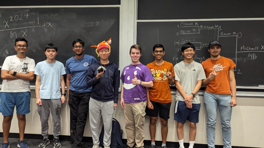 July 18, 2025, Filed Under: EventsIntegration Bee 🐝 Background Starting in Fall 2024, Math Club began hosting the official UT Austin Integration Bee competition annually. The competition is open to all UT students. 2025 Results The 2nd Integration Bee took place on Tuesday, October 14th, 2025. Eight students advanced to the Final Round: The top four students in 2025 were (pictured below with their prizes): Winner: Nikhil Reddy (Grand Integrator) Runner-up: Michael Xiang Semifinalists: Sarthak Jain, Cosmo Wu 2024 Results The 1st Integration Bee took place on Tuesday, November 12th, 2024. Eight students advanced to the Final Round: The top four students in 2024 were (pictured below with their prizes): Winner: Michael Xiang (Grand Integrator) Runner-up: Rishabh Mallidi Semifinalists: Calvin Chiu, Eric Liang