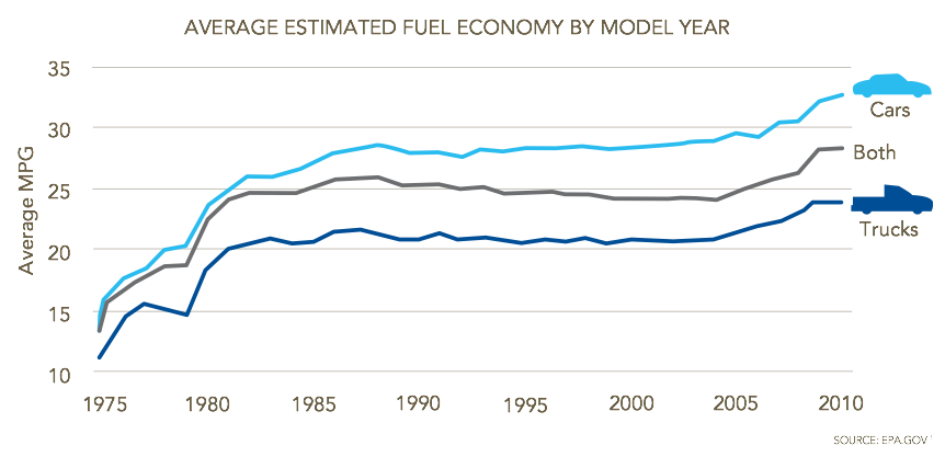 Fuel economy has improved dramatically since the first set of CAFE standards went into effect. Currently, the new iteration of CAFE standards should lead to 39 mpg passenger cars and 30 mpg light trucks by 2016. This is being accomplished by improving tire rolling resistance, better aerodynamics, reducing vehicle weight, and using redesigned transmissions powered by smaller engines. In addition, hybrid and electric vehicles will be an important contributor to energy security. More in-depth information about transport technology improvements is available in the Transport Sector report.