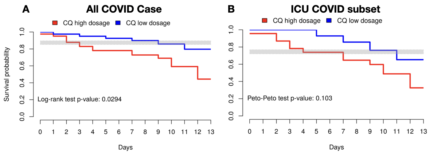 One of the first papers outlining patient health outcomes from chloroquine was released with a previously under discussed topic of dosage (Borba et al.). This study used both a high and low dose of chloroquine, which showed no clinical health outcome differences for low-dose chloroquine versus standard care and worse outcomes for high-dose chloroquine therapies (Figure 1A, Borba et al.). This trend also extended to the subset of patients who had critical cases and placement in the ICU (Figure 1B, Borba et al.). As a result, this trial had to end prematurely due to the detriment of the high dosage.