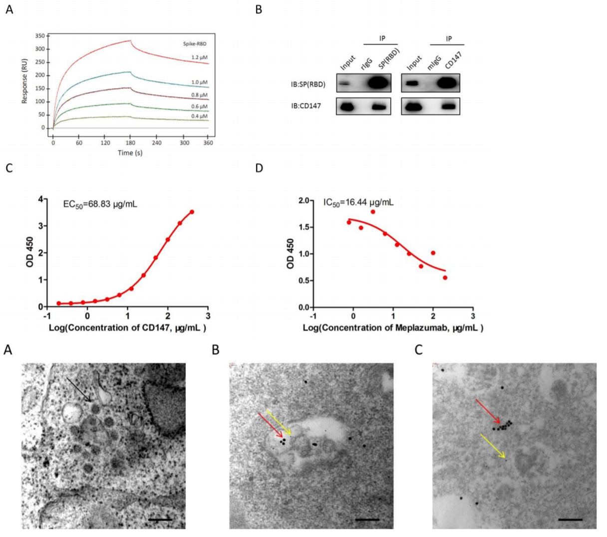 ACE2 is well established as the primary target for viral attachment and entry for both SARS-CoV-1 and SARS-CoV-2 (Li et al., 2005; Zhang et al., 2020). In addition, several other molecules have been discovered to play an accessory role in permitting viral entry into host cells. One of these accessory proteins is a molecule called TMPRSS2, a serine protease that acts to prime the viral spike (S) protein of SARS-CoV-1 prior to interaction with ACE2 and was also found to be implicated in the attachment of SARS-CoV-2 (Hoffman et al., 2020). More recently, CD147 was found to be a novel mediator of viral attachment in SARS-CoV-2 infection. CD147 is a membrane-spanning glycoprotein that is prominently associated with tumor development, protection from plasmodium invasion, and viral infection: it has been shown to inhibit signaling pathways of the tumor suppressor p53, block red blood cell infection of the protozoan that causes malaria P. falciparum, and facilitate HIV invasion (Huang et al., 2014; Zhang et al., 2017; Pushkarsky et al., 2001). Previously, Wang et al. showed that CD147 facilitates SARS-CoV-1 entry, which could be inhibited by CD147-antagonist peptide-9 in the HEK293T cell line (Chen et al., 2005). Here, they first demonstrated that humanized anti-CD147 monoclonal antibody Meplazumab competitively inhibited binding of the S protein and CD147 – compared to controls, CD147-blocked cells displayed significantly less infection by SARS-CoV-2. Additionally, Surface Plasmon Resonance (SPR, Top figure 1A) and co-immunoprecipitation with anti-CD147 and anti-S protein (Top figure 1B) confirmed the interaction of the two molecules with micromolar affinity (Kd = 1.85 x 10-7 M); and competitive direct ELISA (Top figure 1C-D) confirmed a dose-dependent interaction and its inhibition by Meplazumab. Follow-up observation by electron microscopy in infected Vero E6 cells (Bottom figure 1A-C) demonstrated significant co-localization of CD147 and S protein in viral inclusion bodies (Wang et al., 2020). The discovery of novel routes of entry provides unique opportunities for supplementing the molecular arsenal against SARS-CoV-2.