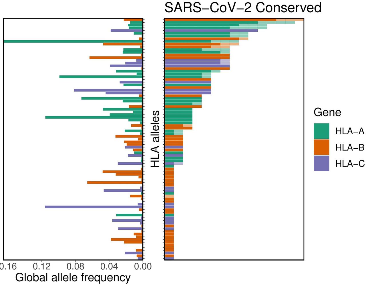 In order to determine the extent of cross-reactive immunity that may be conferred by prior exposure to other human coronaviruses, the authors aligned reference sequence data for 5 essential coronavirus proteins – ORF1ab, spike (S), envelope (E), membrane (M), and nucleocapsid (N) – from 34 distinct coronaviruses. They identified 48 conserved amino acid sequences; 44 of these sequences they anticipated would produce at least one 8- to 12-mer peptide also found within at least one other human coronavirus (Figure 2), for a total of 564 peptides. The binding affinity analysis was repeated for these potentially cross-reactive peptides. It was demonstrated that the alleles HLA-A*02:02, HLA-B*15:03, and HLA-C*12:03 had the highest predicted binding affinity for conserved peptides. However, 56 different alleles (including HLA-B*46:01) demonstrated no significant binding affinity to any conserved peptides. The authors note that this suggests a lack of potential cross-protective immunity in individuals expressing any of these 56 alleles. Again, they indicate that capacity for conserved peptide presentation among the 564 tested alleles is not correlated with the frequency of the given alleles in the global population (Figure 3).