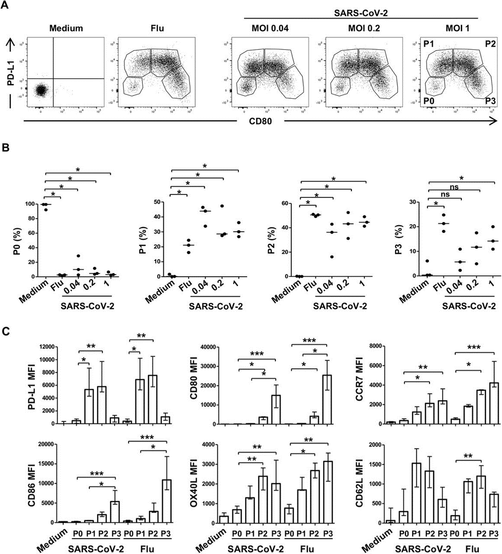 Several immune checkpoint markers are upregulated on the surface of pDCs upon activation and differentiation. These markers are critical in directing subsequent T cell stimulation and serve as markers of pDC differentiation. The authors assessed the effect of SARS-CoV-2 on checkpoint marker expression. In general, the markers CD80, CD86, CCR7, OX40L, and PD-L1 were upregulated on the cells, though specific patterns of upregulation are given in Figure 2. The upregulated expression of the checkpoint molecules persisted at significant levels at 48 hours – in particular, CD80/CD86 expression on P3-subset cells.