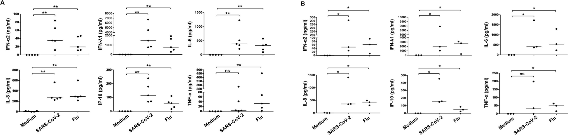 In addition to their role as the primary producers of type I interferons, pDCs also produce type III interferons, as well as a small subset of inflammatory cytokines. After 24 hours in culture with SARS-CoV-2 or the influenza virus, levels of all three – type I interferons, type III interferons, and cytokines – were significantly elevated compared to controls. Specifically, IFN-α (type I), IFN-γ (type III), the chemokine IP-10, and the cytokines IL-6 and IL-8 were all upregulated in both the SARS-CoV-2 and flu treatments. Tumor necrosis factor-α, another inflammatory cytokine, was only “marginally” induced by SARS-CoV-2. These results persisted at 48 hours in culture (Figure 3). One of the primary points of entry for SARS-CoV-2 into the human body is the oropharyngeal mucosa. Due to this fact, the authors validated their findings from peripheral pDCs using pDCs purified from tonsils. They observed significant activation and differentiation of the tonsillar pDCs into each of the three subsets; the tonsillar pDCs also produced significantly elevated IFN and cytokines, similar to peripheral pDCs.