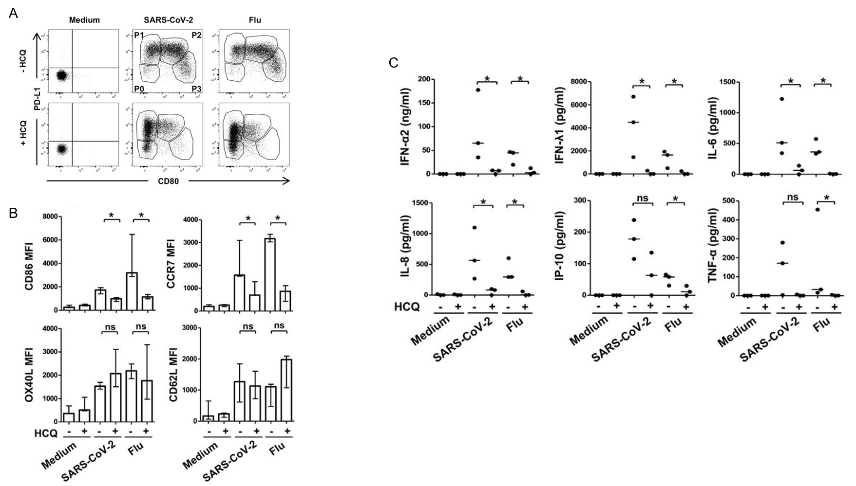 Finally, the authors hoped to determine the effects of pharmacological agents on pDC activation, differentiation, and cytokine/interferon production. Plasmacytoid DCs were cultured for 24 hours with SARS-CoV-2 in the presence or absence of hydroxychloroquine (HCQ). Post culture, pDC diversification was found to be reduced or altogether inhibited: P2 and P3 subset differentiation was almost entirely inhibited; this reduction was HCQ dose-dependent (Figure 4). The decrease in distinct subsets was accompanied by a decrease in several immune checkpoint markers, including CD80, CD86, and CCR7. There was also a significant decrease in IFN-α, IFN-γ, IL-6, and IL-8. In all, these data demonstrate that HCQ inhibits SARS-CoV-2 activation of pDCs and may actually result in adverse immune conditions for fighting against the infection.