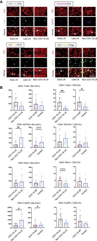 Figure 4 – Th1 Cells Are Expanded in Comparison to Other CD4+ T Cell Subsets in COVID-19 Thoracic Lymph Nodes and Spleens (A) Representative multi-color staining showing TH1, TH2, TH17, and T reg cells in lymph nodes form early (left) and late (middle) COVID-19 patients and a non-COVID-19 control (right; TH1: CD4+ [red] T-bet+ [light blue]; TH2: CD4+ [red] GATA3+ [purple]; TH17: CD4+ [red] RORg+ [yellow]; T reg cell: CD4+ [red] FOXP3+ [green]). (B) Absolute numbers and relative proportions of TH1, TH2, TH17, and T reg cells in lymph nodes and spleens (purple) from early (purple, lymph nodes: n = 5; spleens: n = 4) and late (red, n = 6) COVID-19 patients and controls (blue, lymph nodes: n = 6; spleens: n = 7). Mann-Whitney U test was used to calculate p value. Error bars represent mean ± SEM. *p < 0.05; **p < 0.01. See also Figures S5, S6, and S7 and Tables S1, S2, and S3. (Kaneko et al. 2020)The authors further analyzed preservation of AID-expressing B cells, non-germinal center derived B cells and circulating B cell population in patients with systemic inflammation, characteristic of severe COVID-19.
