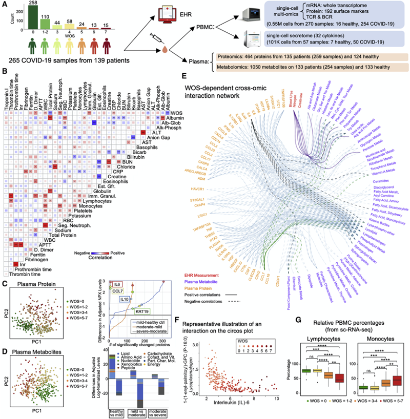A recent study published in Cell aims to understand the relation between elevated inflammation signals, plasma metabolite composition, and immune cell dysfunction by analyzing plasma and PBMCs (peripheral blood mononuclear cells) from patients across all levels of disease severity (Su et al., 2020). The researchers collected plasma and PBMCs from 258 healthy adult donors and 139 COVID-19 adult patients representative of distinct disease stages. Blood was drawn from each COVID-19 patient at two timepoints, once at initial clinical diagnosis and again a few days later. Disease severity score was based on the WHO ordinal scale (WOS) and was recorded at the time of each blood draw.