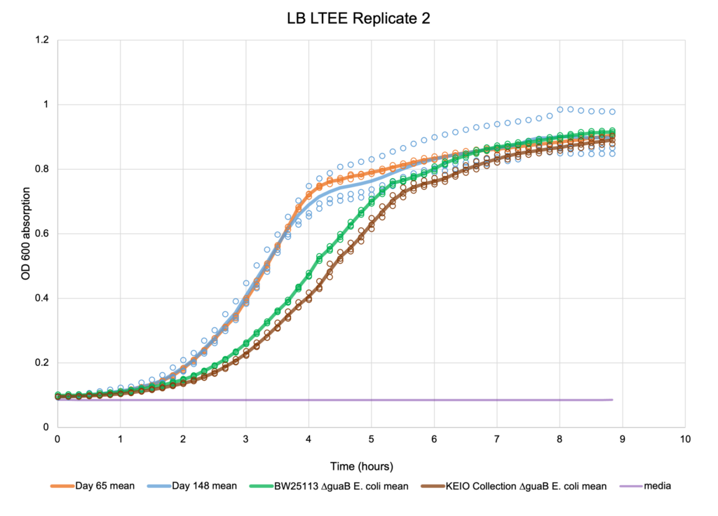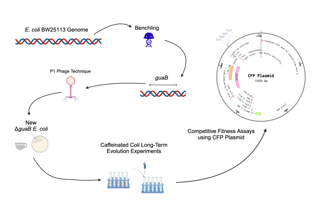 Caffeinated Coli The Caffeinated Coli project has been part of the Microbe Hackers group since before we existed. These bacteria have been modified to be “addicted” to caffeine. If they don’t have caffeine, they can’t grow! However, if you give them caffeine, they’ll grow until they metabolize all of the caffeine present. We can count the final number of cells grown to determine how much caffeine was originally present. This “bioassay” is very accurate; we can use it to calculate the amount of caffeine in a cup of coffee, a can of coke, or an energy drink. Schematic of how Caffeinated Coli works. The introduced genes allow for demethylation of caffeine, also known as 1,3,7-trimethylxanthine. This results in the formation of xanthine, which is readily converted into guanine, allowing the cells to grow. Figure from Quandt, et al. 2013; “Caffeinated Coli 1.0”. The original “Version 1.0” was pioneered by the 2012 UT Austin iGEM team with Professor Barrick, published in 2013, and used in Austin by the 2014 iGEM students. Our “Version 2.0” (initiated in 2015 and published in 2019) can identify specific methylxanthines: not only caffeine, but also theophylline, theobromine, etc. This bioassay is as good as standard chemical methods, such as HPLC. Current Microbe Hackers are investigating different aspects of the Caffeinated Coli system or developing a educational kit for using Caffeinated Coli in high schools. Our active subprojects: Caffeinated Coli Educational Kit. We have created a kit with reagents and materials for a modified, accessible version of our Caffeinated Coli bioassay, along with a five-week synthetic biology module, for high school students to learn about synthetic biology and perform their own bioassay experiment. This kit was implemented for the first time in Austin high schools in Fall 2023. Learn more about the Caffeinated Coli Educational Kit here! Long-Term Evolution Experiment (LTEE). Caffeinated Coli are reliant on methylxanthines due to the deletion of the guaB gene, which is required for de novo guanine synthesis; without this gene, the bacteria must obtain guanine in some other way (such as through the “xanthine salvage pathway,” which converts xanthines into guanine). We are investigating mutations that might arise when ΔguaB E. coli are grown under different selective pressures. LTEE Pipeline: The guaB gene was extracted from the E. Coli genome, using a P1 phage. The LTEE experiment is being conducted on the ΔguaB E. Coli, and a competitive fitness assay is run using CFP plasmid. Figure by Roopa Bindingnavele. OD600 Absorbance of ancestral ΔguaB E. coli, seen in brown and mutated strains, seen in blue and orange.Figure by Roopa Bindingnavele. PurR Project. We have previously found that our ΔguaB E. coli have a mutation in the purR gene. The PurR repressor protein normally regulates the metabolism of purines (like guanine, which our Caffeinated Coli produce from methylxanthines). We are investigating how the purR mutation affects the growth of ΔguaB E. coli. NdmE Project. Caffeinated Coli are able to metabolize caffeine using an operon (group of genes) from the bacteria Pseudomonas putida CBB5. When Version 1.0 was created, we didn’t have the full sequence for one of these genes (ndmE), so we substituted a similar gene from a different species. We now have the ndmE sequence and are investigating the effect of “restoring” ndmE to the Caffeinated Coli operon.