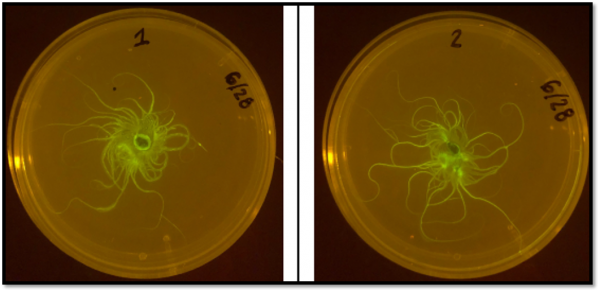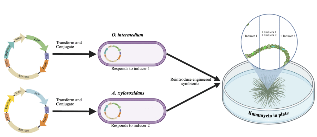 Cyanobacteria Project O. lutea with GFP+ symbionts reintroduced. Filaments colonized with engineered bacteria glow green. The Cyanobacteria project was first started by our iGEM students in 2016. A couple of advanced undergraduates wanted to work on cyanobacteria, which are photosynthetic blue-green algae. Under the guidance of Professors Mishler and Barrick, the project started in 2016, and it has become an active area of research in the Microbe Hackers lab with students working both on characterizing the growth of these bacteria (we use several Oscillatoria species) and genetically engineering the bacteria to serve as biosensors for water pollutants. Along the way, this work has been supported by the UTEX Culture Collection of Algae and the curator, Dr. Nobles, with many hours of input, feedback, advice, and of course culture samples. Current goals for the THP + OHC14 subgroups within the Cyanobacteria project. Figure by Meghna Vergis Our active subprojects: THP + OHC14 Biosensors. Because biosensors for water pollutants can be unreliable, we are using well-characterized biosensors for THP and OHC14 as proof-of-concept. Each plasmid expresses a fluorescent protein in the presence of their corresponding substance. Our overall goal is to put these plasmids into the bacteria that live on cyanobacteria, allowing them to coexist in a single culture. With this system, just one cyanobacteria filament could be used to detect multiple different substances at the same time. Currently we are working on testing the efficacy of the THP and OHC14 biosensors, getting the plasmids into the bacteria that live on cyanobacteria, and putting the engineered bacteria onto the cyanobacteria filaments. Riboswitches. We are experimenting with biosensors that use riboswitches, regulatory ligand-binding RNA sequences, instead of repressor proteins, to control expression of our fluorescent output. For example, our theophylline riboswitch biosensor expresses green fluorescent protein when the riboswitch binds theophylline. Currently, we are working on improving the degree to which these switches can be turned on or off.