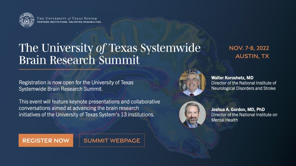 September 17, 2022, Filed Under: NewsRegister: Brain Research Summit -The University of Texas Systemwide Please register to the University of Texas Brain Research Summit Summit date: Nov 7-8 Place: Austin The University of Texas Systemwide Brain Research Summit brings together national leaders, researchers from across various UT institutions, and key partners for collaborative discussions around advancing brain research in the state of Texas. Objectives Share clinical and basic research advancements occurring within University of Texas System (UTS) institutions across the state Foster collaborative neuroscience research in Texas, especially among UTS institutions Identify challenges and opportunities to advance brain research in Texas and nationally