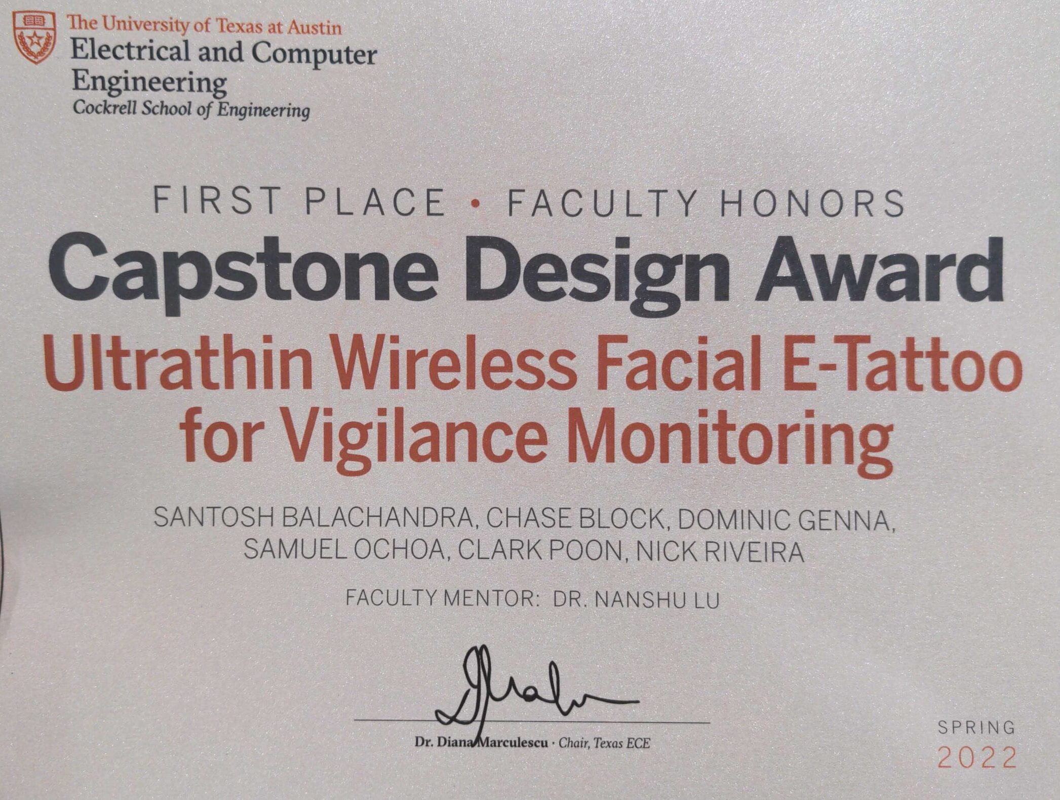 - – 5.2022 – Our incredible undergraduate Chase and his senior design team has earned first place at the Capstone Design Team Competition! Congratulations and we are so happy to see the fruits of your efforts shine brightly!