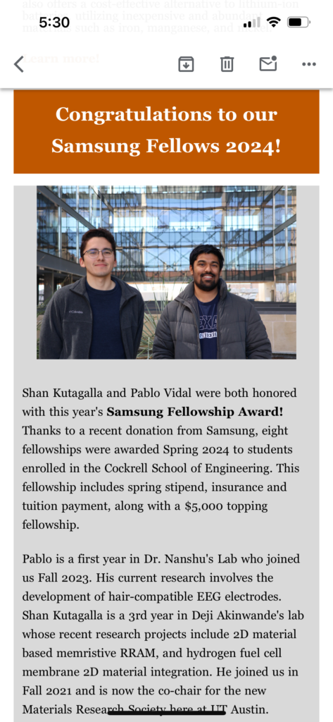 - -07.2024 – Hearty congratulations to Sarnab Bhattacharya for winning George J. Heuer, Jr. Ph.D. Endowed Graduate Fellowship from the Cockrell School of Engineering