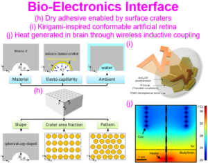 To enable reliable but reversible bio-electronics interface adhesion, my group has conducted theoretical, numerical and experimental investigations on an emerging class of dry adhesives with surface craters in both ambient and underwater environment (h).17,18,19,20,21,22 This series of work has been summarized in an invited review paper.23 Sometimes conformability has to be achieved between stiff (due to high-device-density) membranes and non-developable surfaces such as the example of the artificial antenna (i).24 In this case, cuts inspired by kirigami were used to minimize buckle delamination and enhance conformability. Conformable contact affords effective heat transfer at the bio-e interface, which has been modeled in finite element (j) and the model was used to guide the design of the wireless brain patch for tumor treatment (n).25