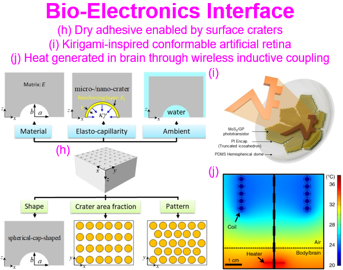 To enable reliable but reversible bio-electronics interface adhesion, my group has conducted theoretical, numerical and experimental investigations on an emerging class of dry adhesives with surface craters in both ambient and underwater environment (h).17,18,19,20,21,22 This series of work has been summarized in an invited review paper.23 Sometimes conformability has to be achieved between stiff (due to high-device-density) membranes and non-developable surfaces such as the example of the artificial antenna (i).24 In this case, cuts inspired by kirigami were used to minimize buckle delamination and enhance conformability. Conformable contact affords effective heat transfer at the bio-e interface, which has been modeled in finite element (j) and the model was used to guide the design of the wireless brain patch for tumor treatment (n).25
