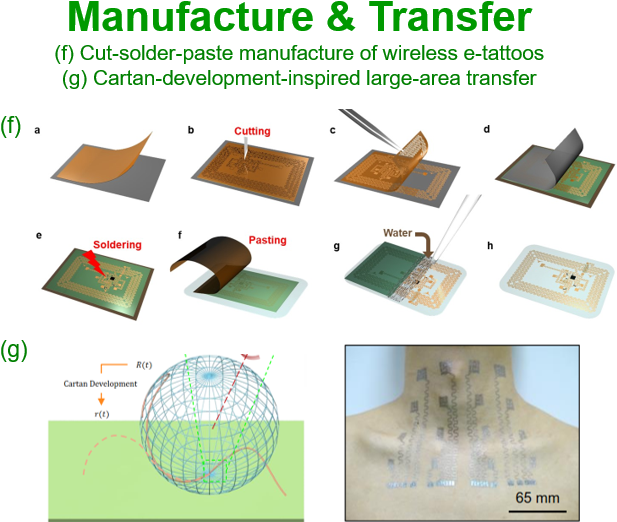 The conventional fabrication method for stretchable electronics is labor and cost intensive, which significantly hinders their translation from lab prototypes to clinical use. To overcome such limitations, my group developed a dry and freeform (subtractive) manufacturing process for the rapid prototyping of stretchable e-tattoos called the “cut-and-paste” method in 2015.14 In 2019, we upgraded it to the “cut-solder-paste” process (f) which allows the incorporation of rigid integrated circuits (ICs) such as microprocessors and near field communication (NFC) chips to form wireless e-tattoos (e.g. k).15 We reported that multi-channel, large-area but ultrathin, filamentary e-tattoos could be reliably pasted onto non-developable human body through a math concept called the Cartan development (g).16 Such e-tattoo conformed to the forearm as shown in (m) could conduct 16-channel surface electromyography (sEMG), which can be used for sign language recognition and prosthesis control.