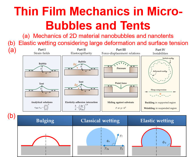 Flexible and stretchable electronics make use of all kinds of thin films including metallic, ceramic, polymeric membranes and even atomically thin solids called 2D materials. Poking and bulging are widely used setups for characterizing the mechanical and interfacial properties of thin films. We call the poked and bulged thin solids to be tents and bubbles (a-b), respectively. Although classical elasticity solutions are available for macroscale poking and bulging problems, the boundary condition has been largely limited to clamped edges and the electrocapillary effects are too trivial to be considered. At microscale, however, the behaviors of the bubbles and tents are governed by the interplay of nonlinear elasticity, surface and interface effects, as well as instabilities. As a result, my group has carried out a series of in-depth mechanics modeling works along with a few experimental validations to have successfully answered the following important questions: 1) How do surface and interface energies dictate the geometry of the bubbles?1,2 2) How does the edge slippage modify the mechanical responses of the tents and the bubbles?3 3) How do the radial buckle delaminations form and what are their indications?4 4) How would those effects modify the load-deflection or the p–V curves?2,5 These fundamental understandings have led to a few significant impacts: 1) They provide guidance for the deterministic formation of micro-bubbles and tents. 2) They offer a direct solution to the pressure, force, and strain in micro-bubbles and tents simply out of their geometry. 3) They allow reliable extraction of the elastic and interfacial properties of 2D materials and ultrathin polymeric membranes which are otherwise difficult to handle and measure. We have also published three well-received invited review papers on 2D material mechanics.6,7,8