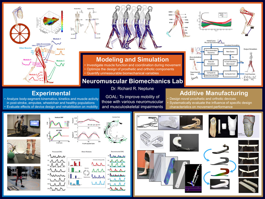 Our lab’s research interests are in the areas of musculoskeletal and sport biomechanics and neuromotor control of human movement. Our research integrates musculoskeletal modeling, computer simulation and experimental analysis techniques to analyze various patient populations including athletes, lower-limb amputees, individuals post-stroke, and those with spinal cord injuries. Other research is directed at optimizing orthotic and prosthetic designs to enhance their performance. Research projects have been funded primarily by the VA, DoD, NSF and NIH.