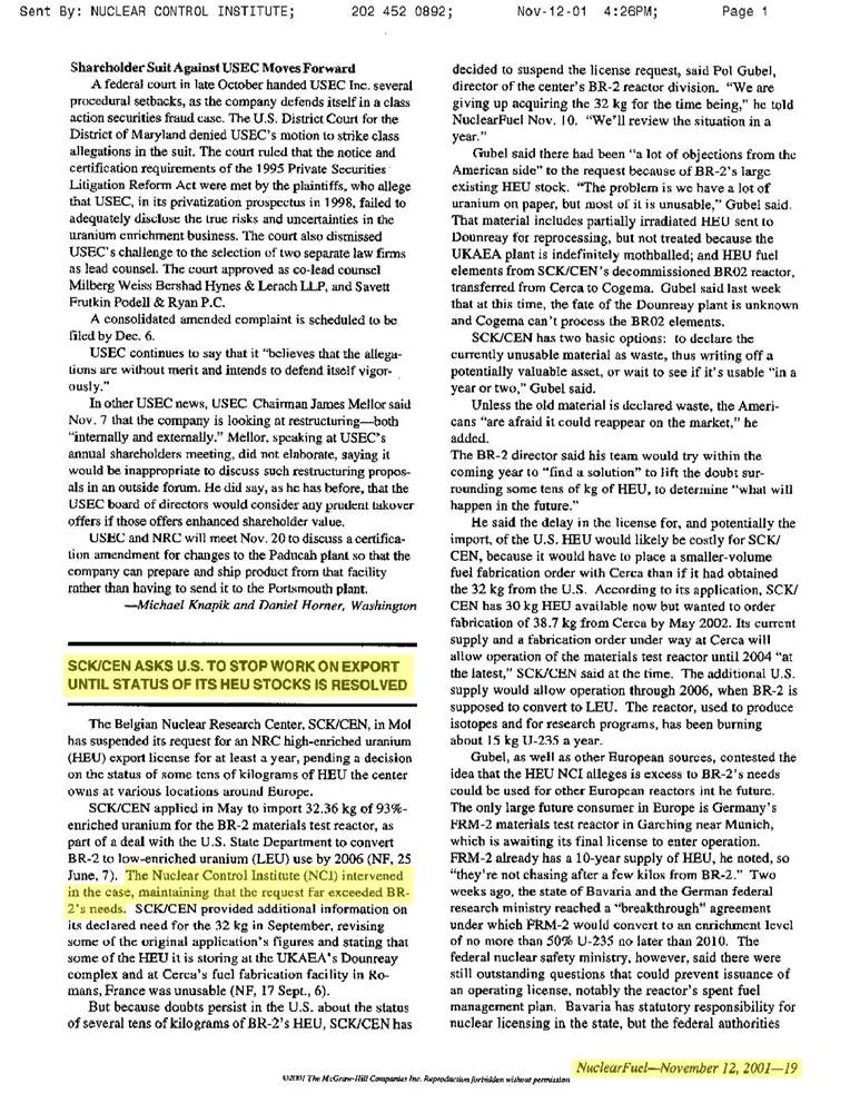 Facing NPPP Petition, Belgium Drops Request for Bomb-Grade Uranium