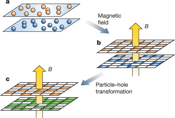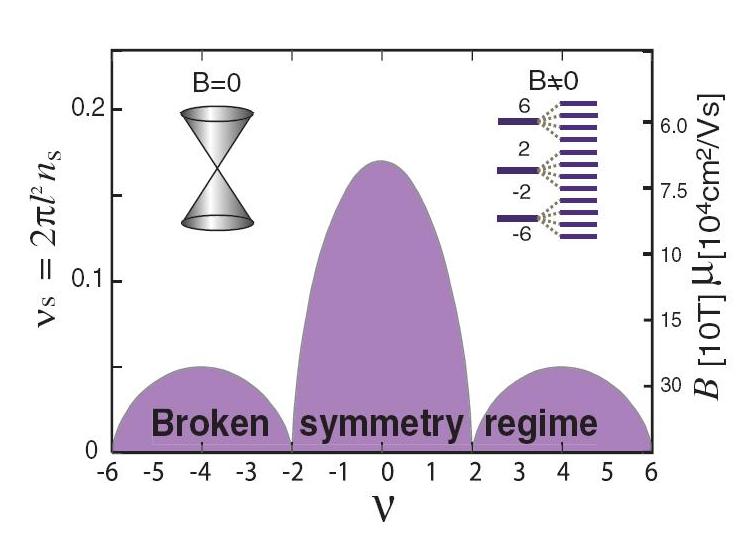 April 2, 2024, Filed Under: HighlightsAbout Allan MacDonald Professor and Director Curriculum VitaeMacDonald GroupAlumni GrapheneGraphene is an atomically two-dimensional electron system made of a single layer of carbon atoms arranged on a honeycomb lattice. Interest in graphene has exploded in recent years because of the achievements of experimental research groups at the University of Manchester and Columbia University who have managed to isolate graphene layers and measure their electrical properties. At low-energies graphene is described by relativistic quantum mechanics with the role of spin played by the psedospin degree of freedom associated with the two atoms in the honeycomb lattice unit cell. Our theoretical research has concentrated on interaction effects in the quantum Hall effect of graphene, which have so far been mainly the appearance of SU(4) quantum Hall ferromagnetism, and on the differences between the Fermi liquid properties of graphene and an ordinary non-relativistic two-dimensional electron system in a quantum well.Phase diagram for SU(4) quantum Hall ferromagnetism in the n=0 and n-1 Landau levels of graphene. Phys. Rev. Lett. 96, 256602 (2006). Metal SpintronicsFerromagnetism in transition metals and transition metal compounds has been studied for decades and is the basis for much of a major applied physics subfield, magnetism and magnetic materials. These materials are nonetheless remarkable because the ordered state is remarkably robust, surviving well beyond room temperatures. Metal spintronics is the study of the interplay between magnetic and transport properties in these materials. The major topic in metal spintronics over recent years has been current-induced-torque phenomena, mainly spin-transfer phenomena, in which the magnetic order parameter can be manipulated by the altered exchange fields of a metal which carries current. Our research has focused on a microscopic picture of the effect which suggests that it is much more general than had previously been supposed. We have predicted current induced torques in antiferromagnetic metals, for example, which appear to have been seen in recent experiments. Cold Atom SystemsOver the past several years an area of theory has built up at the intersection of condensed-matter and atomic physics. Atomic physicists have learned to cool clouds of atoms to extremely low temperature where they behave as quantum particles. By taking advantage of atomic physics phenomena like Feshbach resonances and optical potentials, it is possible to create systems of strongly interacting quantum atoms. In other words these atomic vapors act behave like condensed matter systems and not like gaseous vapors. These cold atoms systems can be used to address some of the most difficult problems in condensed matter physics from both experimental and theoretical points of view. Some of the problems that are being studied in our group include rapidly rotating bosons (the boson quantum Hall effect), fermionic atom systems near a Feshbach resonance, and quasi-one-dimensional atomic systems. Quantum Hall SystemsThe quantum Hall effect occurs in two-dimensional electron systems that are confined to a quantum well or a heterojunction in a semiconductor when the system is placed in a perpendicular magnetic field. The quantum Hall regime has been the source of a multitude of new phenomena in condensed matter physics for over twenty years. The quantum Hall regime is special because cyclotron orbit kinetic energy is quantized. All electrons must lie in macroscopically degenerate Landau levels. (Landau levels are sets of orbitals with the same kinetic energy.) Landau level degeneracy enhances the importance of both interactions and disorder and can lead to ground states with very novel properties, most notably perhaps to states with quasiparticles that have fractional charge and fractional statistics. Recent work in the group has focused either on excitonic superfluidity in quantum Hall systems or on the properties of the one-dimensional electron systems that exist at quantum Hall edges.An electron-electron bilayer system in a strong magnetic field is equivalent to an electron-hole bilayer. Nature 432, 691 (2004). NanoparticlesPhysicists and chemists have developed a wide variety of different techniques that can be used to create and study either individual or arrays of condensed matter particles that have an overall size that in the nanometer range, so-called nanoparticles. A typical nanoparticle contains from 100 to 10000 atoms. In some cases it has been possible to make electrical contact to an individual nanoparticle. In our group we have been interested in what happens to bulk ferromagnetism in the nanoparticle limit, and in transport through arrays of either paramagnetic or ferromagnetic particles.Planar projection of the total Berry curvature for a 25-atom nanoparticle. Phys. Rev. Lett. 91, 046805 (2003).