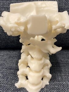February 13, 2023, Filed Under: News3D Printing to Aid Neurosurgery Planning A 3D replica of a patient’s spine Through the generosity of the Jedel Family Foundation, the neurosciences program is implementing three-dimensional presurgical modeling using a Formlabs 3BL 3D printer with Materialise Mimics software. This equipment will allow us to create three-dimensional models from a patient’s imaging studies that can facilitate surgical planning and serve as a teaching tool for patients, family members, and learners. One patient who has benefited from 3D printing was a 17-year-old with Down syndrome who suddenly refused to swallow. A cervical CT confirmed a severe C1 dislocation with C1-2 instability and compression of the spinal cord. The 3D replica of the patient’s spine allowed for development of a surgical plan that avoided narrowing of the spinal canal, and the patient recovered completely after surgery.