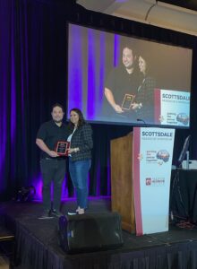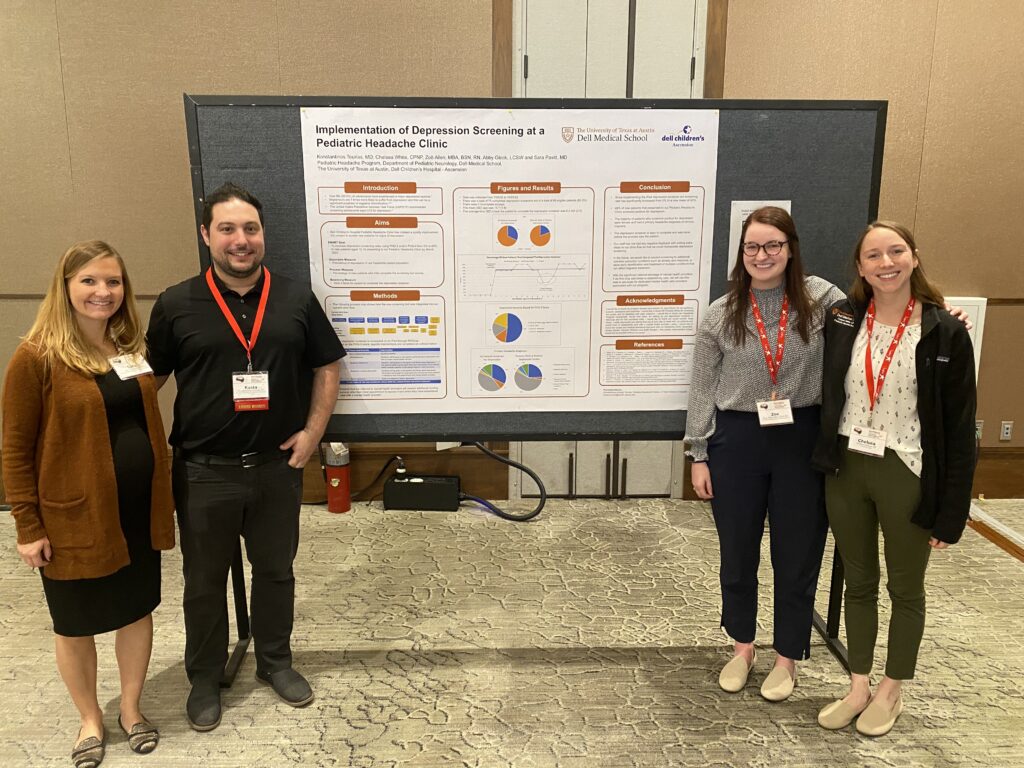 February 14, 2023, Filed Under: NewsTourlas Receives Frontiers in Headache Research Scholarship Sara Pavitt, MD, Konstantinos Tourlas, MD, Zoë Allen, RN, and Chelsea White, MSN, APRN, CPNP-PC, at the Scottsdale Headache Symposium poster exhibit Congratulations to pediatric neurosciences headache fellow Konstantinos Tourlas, MD, who received the Frontiers in Headache Research Scholarship Award from the American Headache Society at their 2022 annual meeting in Scottsdale, Arizona. Tourlas, one of 11 award recipients, was recognized for a quality improvement project implementing depression screening in the Dell Children’s Pediatric Headache Center. Konstantinos Tourlas, MD, at the Frontiers in Headache Research Scholarship awards ceremony