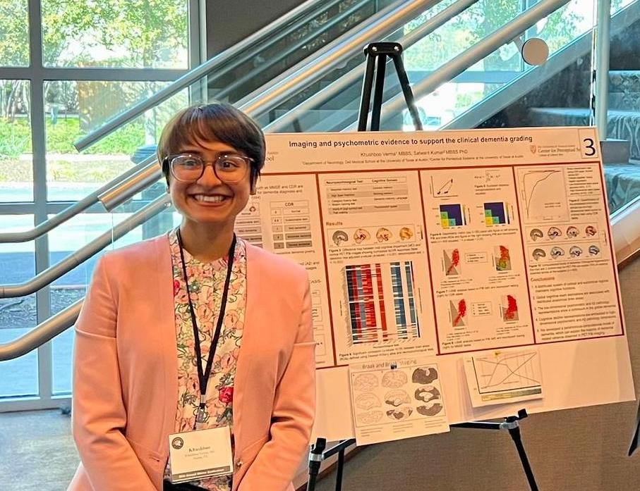 March 6, 2023, Filed Under: carousel, NewsResident Places Third in Texas Neurological Society Poster Competition Khushboo Verma, MBBS, PGY-4, and E. Steve Roach, MD, at the TNS 2023 Winter Conference Congratulations to pediatric neurology resident Khushboo Verma, MBBS, whose poster entitled “Imaging and Psychometric Evidence to Support the Clinical Dementia Grading” received third place in the Texas Neurological Society’s winter conference resident poster competition. Verma’s research explores the neural and behavioral basis of clinical dementia rating scales and proposes a computational model of dementia that explains most dementia-related variance observed in Pittsburgh compound B (PIB) PET imaging. She was the only Dell Med resident to receive a prize.