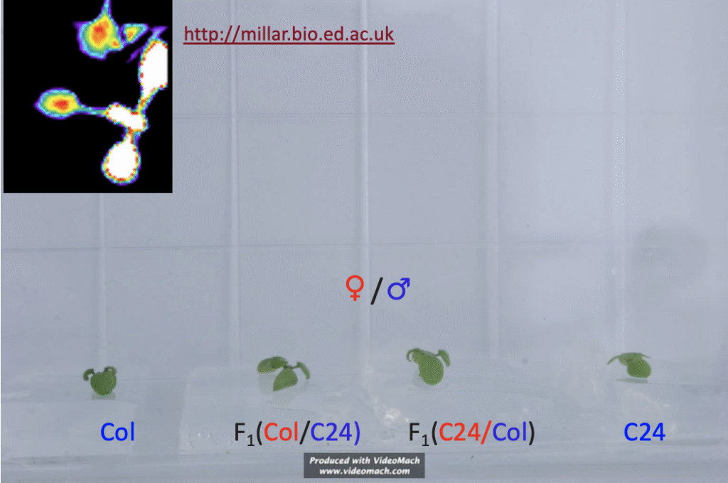 Heterosis Resources Terminology Contact Us Publications News Links Data Hybrid vigor or heterosis is a fascinating phenomenon with far-reaching impact on human health and agriculture. Heterosis refers to increased growth and fertility of the offspring that is superior to one or both parents, as seen in Arabidopsis and maize (or corn); all commercial corn grown in the U.S. is hybrid. The concept of heterosis extends beyond plants to include farm animals and humans. In humans, heterosis manifests in many ways, including improved stature, attractiveness, and intelligence. Heterozygote advantage, as observed in sickle cell anemia, shows heterozygote carriers having a selective advantage against certain diseases such as malaria. Conversely, inbreeding depression leads to diseases and low fertility because of reduced genetic diversity and unmasking of deleterious alleles. Since Charles Darwin systematically described heterosis in 1867, genetic models including dominance and overdominance have been debated over a century but cannot fully explain the basis of heterosis. Hybrid vigor in corn hybrids and Arabidopsis allotetraploids. In A. thaliana, circadian regulators affect rhythms and period of the clock as well as its input and output pathways. At least ~10% of genes, including those involved in photosynthesis and starch metabolism, and up to 30% of transcriptome are regulated by the circadian rhythms. Moreover, day-length and circadian effects on transitory starch metabolism correlate with diurnal expression of these metabolic genes. Hence, maintaining circadian regulation increases CO2 fixation and growth, whereas disrupting circadian rhythms reduces fitness. Using Arabidopsis hybrids and allopolyploids as experimental systems, we are testing how and why circadian rhythms are altered to promote growth vigor and improve fitness. We made seminal contributions to the understanding of molecular bases of hybrid vigor and inbreeding depression. Our studies have linked altered circadian rhythms with increased growth vigor in plant hybrids and allotetraploids. Hybridization induces epigenetic changes to alter clock gene expression waveforms of CCA1 and LHY and the reciprocal regulators TOC1 while to maintain the clock period, which in turn increase the expression of circadian output genes in photosynthetic and metabolic (starch) pathways, leading to growth vigor. The more starch accumulate during the day, the more it can be utilized and degraded at night to promote growth. Altered expression peaks of clock genes CCA1/LHY and TOC1 in F1 hybrid (dashed lines) relative to its parents (solid lines) lead to activation or repression of output biological pathways or regulatory networks, including photosynthesis, starch metabolism, response to biotic and abiotic stresses, flowering and reproductive development, nitrogen assimilation and carbon allocation, and phytohormone signaling and response. Light (white) and dark (black) cycle is shown. This breakthrough finding that linked altered circadian rhythms with hybrid vigor is provocative but logical because the clock regulates metabolism and physiology in plants and animals. mPer2-/- mice lack a glucocorticoid rhythm, while Clock-/- mutant mice are obese and have metabolic syndromes. In humans, energy intake and metabolism have a diurnal rhythm, and disruption of circadian rhythms leads to obesity and cardiovascular diseases. The circadian clock also gates the timing of stress responses in the hybrids, which are normally repressed but activated under stress at specific times of the day. This timing mechanism helps balance defense and growth, enhancing hybrid performance under varying environmental conditions. Moreover, the circadian clock also influences ethylene production, a hormone that typically inhibits vegetative growth but promotes fruit maturation. In hybrids, ethylene response genes are downregulated during the day through a CCA1-mediated pathway and phytochrome interacting factors at night, thus promoting growth vigor. Circadian regulation of hybrid vigor is conserved across species. Hybrids in maize exhibit nonadditive expression patterns of key enzymes in photosynthetic and photorespiratory pathways, optimizing metabolic processes and enhancing overall plant growth. We further identified reversible epigenetic modifications of TCP-target genes as a key factor in inbreeding depression in maize. This discovery adds another layer to understanding how genetic and epigenetic factors interplay to influence plant fitness. Our contributions have shifted the paradigm from traditional genetic models to a focus on the molecular and regulatory mechanisms underpinning hybrid vigor and inbreeding depression. Our research provides new avenues for manipulating hybrid vigor to improve crop yields and resilience, including creating growth vigor in non-hybrid strains. Given that ~25% of global carbon emissions are captured by plant ecosystems as biomass and belowground soil-root organic matter, increasing plant biomass and shifting carbon flow towards roots and soil microbiomes provides a long-term solution to carbon sequestration and climate mitigation. Six Selected Publications Ni, Z., Kim, E., Ha, M., Lackey, E., Liu, J., Zhang, Y., Sun, Q., and Chen, Z. J. (2009) Altered circadian rhythms regulate growth vigor in hybrids and allopolyploids. Nature 457:327-331. Chen, Z. J. (2013) Genomic and epigenetic insights into the molecular bases of heterosis. Nature Reviews Genetics 14:471-482. Miller, M., Song, Q., Shi, X., Juenger, T. E., and Chen, Z. J. (2015) Natural variation in timing of stress-responsive gene expression predicts heterosis in intraspecific hybrids of Arabidopsis. Nature Communications 6:7453. Ko, D. K., Rohozinski, D., Song, Q., Taylor, S. H., Juenger, T. E., Harmon, F. G., Chen, Z. J. (2016) Temporal shift of circadian-mediated gene expression and carbon fixation contributes to biomass heterosis in maize hybrids. PLoS Genetics 12(7): e1006197. Li, Z