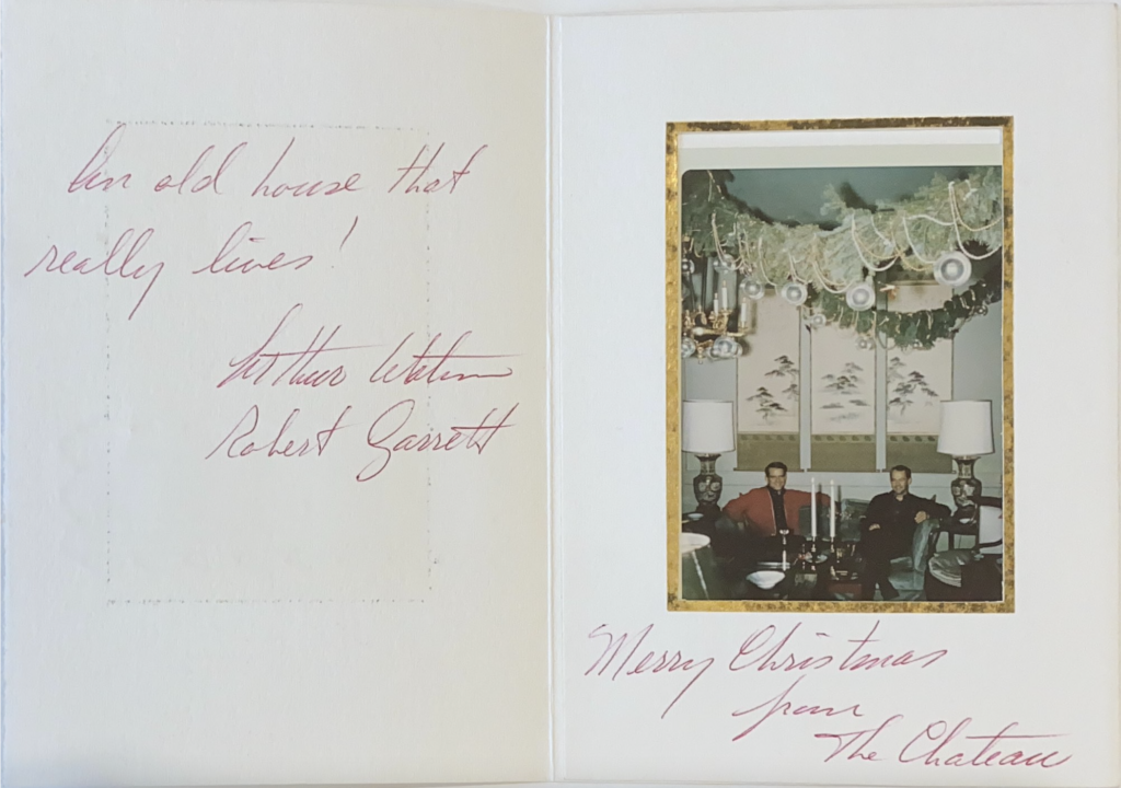 “If at all possible and, if my voice is loud enough, your house will be spared by the bulldozer.” This was the encouraging message received in the summer of 1965 by Arthur Pope Watson, Jr. Watson, a well-connected Austin designer, shared the home located on the edge of the UT campus with his partner, Robert Wayne Garrett. Watson and Garrett worked together and owned an interior design firm, Watson Associates, for over three decades. The note came from Coke H. Dilworth, an architect at the local Brooks, Barr, Graeber, and White firm. Dilworth had just toured Watson’s historic home at 500 East Eighteenth Street and was impressed by its grandeur. Adorned with a French-style mansard roof, lush gardens and grounds overlooking Waller Creek, and opulent interior design hand-curated by Watson and Garrett, the home—nicknamed “the Chateau”—was a breathtaking structure with a fascinating history. The Chateau famously hosted formal dinner parties, cocktail soirees, and holiday fêtes—gatherings that Garrett laughingly described as “very elegant, but… rowdy.” It has been reported that celebrities even visited the Chateau for parties or after performances at the Erwin Events Center, and rumored visitors include actor Rock Hudson and tenor Luciano Pavarotti.