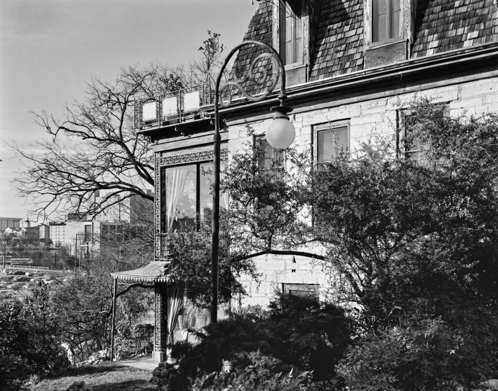 Watson indeed wished to retain the Chateau. Built in 1853, it was one of the oldest buildings in Austin, and was constructed with historic materials: the original structure was fashioned from hand-cut stone that came from the same Austin quarry as the original Capitol building, which burnt down in 1881. Caroline Roget, the Chateau’s previous owner and Watson’s and Garrett’s personal friend, had added numerous features to the home after purchasing it in 1945. According to a 1997 interview with Garrett after Watson’s death, Roget, who was Governor Beauford Jester’s assistant, installed lights and sconces at the Chateau that she had taken from storage buildings at the Capitol, including an outdoor light salvaged from the 1881 Capitol fire. She also hired local artisans Weigl Iron Works to do ironwork on the interior and exterior of the home. When Watson and Garrett purchased the home from Roget in 1959, they enclosed the home’s balconies in glass, built two new garages, constructed the English-style greenhouse, and installed a pool blasted out of solid limestone.