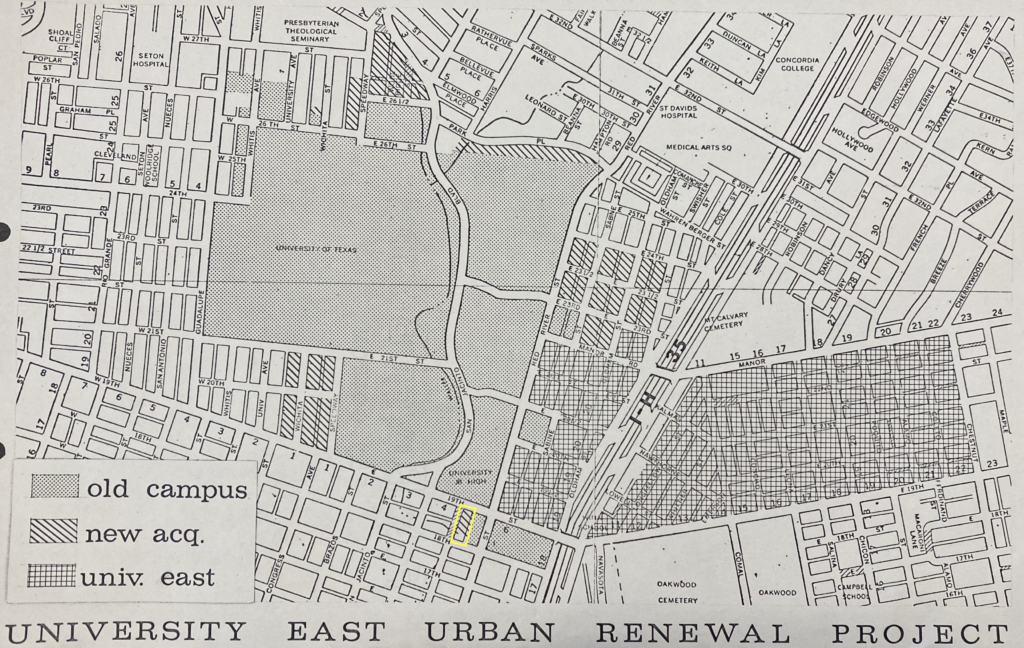 Two years later, the government did want everything, and intended to take it by brute legislative force. Land appraisers and real estate brokers moved in on all sides of the Chateau. Individual landowners of nearby tracts sold their homes to the University, while entire communities were displaced eastward. By 1968, the plan for the land acquired by eminent domain would be shaped into the University East Urban Renewal Project. According to environmental historian Katherine Leah Pace, “the [Project] displaced an interracial neighborhood located just east of the UT campus” and “‘removed the remaining Black families from along the west side of IH-35.’” The University was aggressively invested in making progress on its campus expansion projects; as a March 1965 article in the Daily Texan gravely predicted, “progress, however, demands the past be destroyed.”