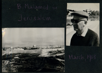 January 1, 2007, Filed Under: UncategorizedRansom Center acquires additional Bernard Malamud materials The Harry Ransom Center recently acquired new materials related to writer Bernard Malamud. These materials, purchased from his daughter, Janna Malamud Smith, complement the existing Malamud archive at the Ransom Center, which comprises more than 37 boxes of correspondence and papers. The Ransom Center acquired the original collection in the late 1990s. Photograph from Bernard Malamud’s 1969 trip to Israel. The new acquisition includes letters between Malamud and various family members, as well as early composition books, materials showing Malamud’s genealogical research, and files kept by Malamud’s wife, Ann, related to Malamud’s life and career. The collection also includes letters from Arlene Heyman to Malamud, dating from 1962 to 1985. Heyman and Malamud met as student and professor at Bennington College in the early 1960s and remained close friends for the rest of Malamud’s life. Prior to this acquisition, these letters were not publicly available to researchers. The recently acquired material reveals Malamud both as a writer and as his family knew him. In a transcription of a conversation between Janna Malamud Smith and Ann Malamud, typed by Malamud Smith and dated May 2000, the two discuss their father and husband’s Jewishness and the ambivalences of his identity as American and Jew. Malamud is widely acknowledged as one the most important Jewish writers of the twentieth century. Photograph from Malamud’s 1969 trip to Israel Page from a scrapbook from Bernard Malamud’s 1969 trip to Israel First page of a scrapbook from Bernard Malamud’s 1969 trip to Israel. Malamud’s Hand-drawn map of city of Kiev ca. 1914, date unknown