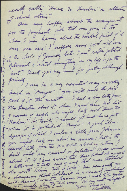 February 23, 2010, Filed Under: Research + TeachingClaude McKay and the "Making of Home to Harlem" Jamaican-born writer Claude McKay (1889–1948) is probably best-known for his poem “If We Must Die.” McKay, however, also published three novels and a collection of short stories. His most popular novel, Home to Harlem (1928), grew out of a short story of the same name. He was encouraged in his work by his literary agent William Bradley, an American whose agency operated out of Paris. Claude McKay’s correspondence can be found in the Center’s William A. Bradley Literary Agency collection. An optimistic McKay wrote to Bradley from Antibes, France in February 1927, “Everything is clear and I can see through the whole story to the end. I ought to have the thing done by the end of March.” However, a series of difficulties beset McKay and slowed his writing process. In mid-March, McKay’s friend Max Eastman was planning to return to the United States and to take his typewriter with him. McKay thought he might have to write long-hand, but on March 26 happily reported “The typewriter problem is almost solved” after he purchased a used typewriter for 550 francs. He noted, however, it “doesn’t work so well. I have already had to take it back to Nice twice…and now it is on the blink again.” In early April, McKay was still working on the manuscript and struggling through financial and creative challenges, writing to Bradley, “I am without any money and should be very obliged to you for sending me two hundred francs….. I got into an impasse for a week nearly and had to destroy everything I wrote. But I got out and am going along smoothly again.” McKay continued to work, and by June the manuscript was complete. In February 1928, McKay finally received the publisher’s “dummy” of the book and had concerns about the dust jacket featuring an illustration by Aaron Douglas: “I like the cover of the book & the color of the jacket but I don’t like the drawing. It looks so much like the stiff skeleton of a black ape. Has no life and one looking at it will naturally link it with Jake [the novel’s protagonist]. Covarrubias could have done something striking & sympathetic, but I suppose I should not grumble & criticize but be loyal and patriotic as the artist is a colored man.” A week later he followed-up with Bradley: “Yes, I think my first opinion about the cover was wrong. It is effective and grows on me. The Senegalese fellows at the café were enchanted with it at first sight. Maybe my plastic sense is a little corrupt and sentimental.” Harper and Brothers released the book with the Aaron Douglas illustration and Home to Harlem went on to become a success, surprising even McKay who was tickled with its popularity “I see Home to Harlem like an impudent dog has nosed right in among the best sellers in New York!” The New York Times declared of McKay’s talent, “it is not a strained, a half-hearted or skimpy talent, but one that is eminently worth more play than one novel.” While McKay went on to write Banjo (1929) and Banana Bottom (1933), these novels failed to live up to the success of Home to Harlem. Please click thumbnails to view larger images. Photograph of Claude McKay, taken for ‘Home to Harlem’ promotion, c. 1928. Page 1 of a letter from Claude McKay to William A. Bradley, dated February 2, 1928. Page 2 of a letter from Claude McKay to William A. Bradley, dated February 2, 1928. Photograph of Claude McKay, taken for ‘Home to Harlem’ promotion, c. 1928. “Home to Harlem” endpapers (Harper and Brothers, 1928 “Home to Harlem” dust jacket (Harper and Brothers, 1928) “Home to Harlem” book spine (Harper and Brothers, 1928)