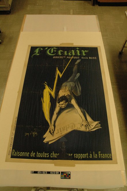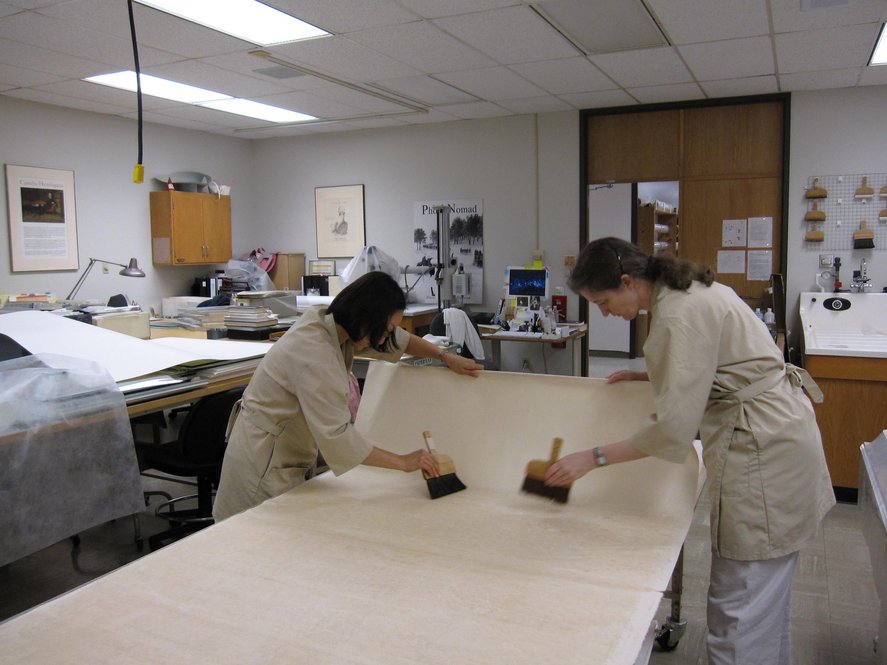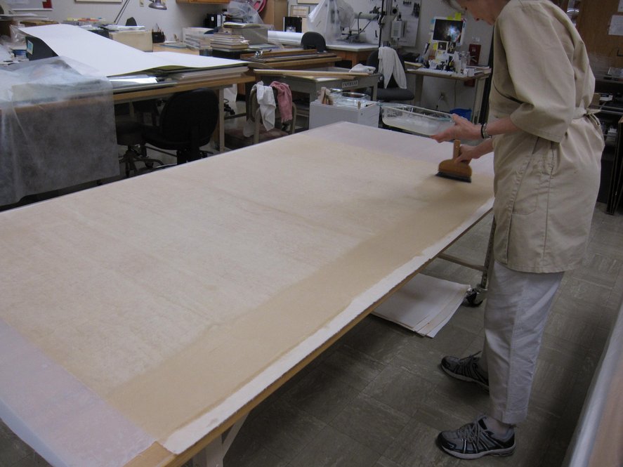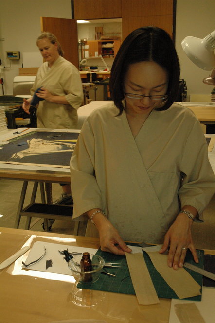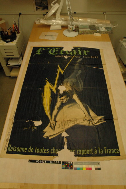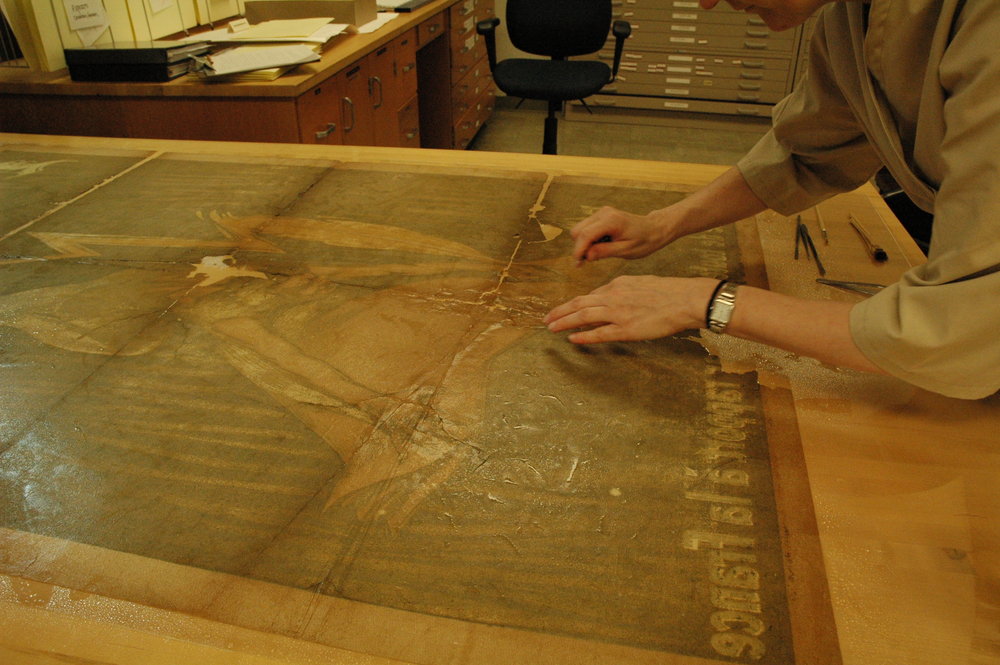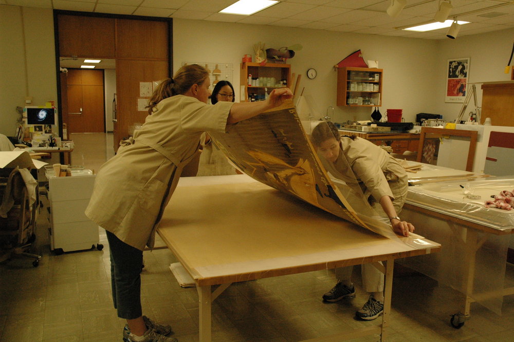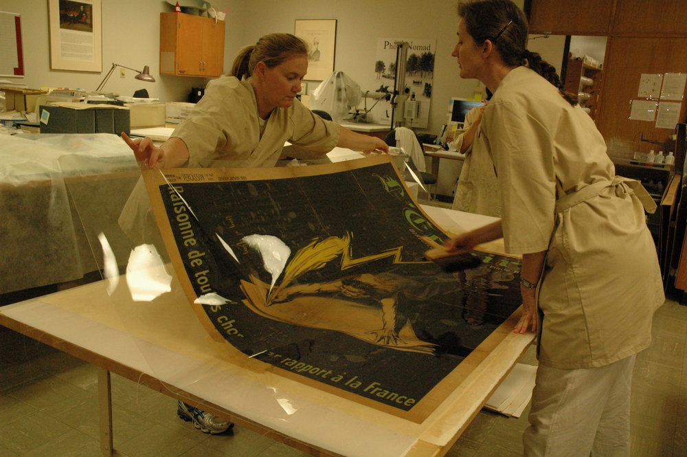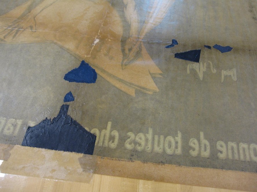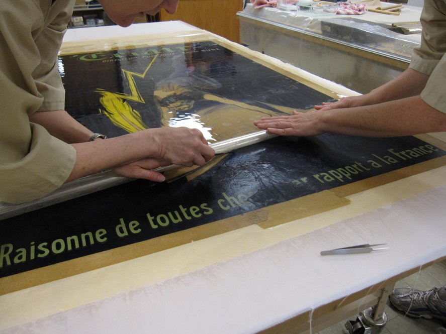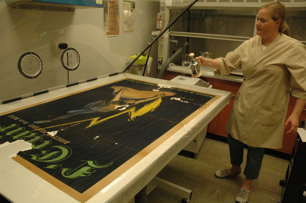 March 18, 2010, Filed Under: Art, ConservationBefore and After: Repairing a poster A poster in the Ransom Center’s Harry Houdini collection arrived just like Houdini would’ve wanted: folded up to an eighth of its size. Stephanie Watkins, Head of Paper Conservation, and her team faced a daunting project: the brittle paper couldn’t easily be unfolded without causing damage to the item. Once they successfully opened the poster, they had to remove dirt, acid, and discoloration, and restore missing pieces. Please click the thumbnails below to view full-size images. L’Eclair poster before treatment School of Information student Laura Bedford washes the poster on the vacuum-suction table. Bedford sprays a water-alkaline solution on the poster as part of washing process to remove acidity. Colored sheets of Japanese paper dry that later will be used to fill in missing sections of the poster. Volunteer Nani Lew cuts and prepares strips of Japanese paper for attachment to the poster. Head of Paper Conservation Stephanie Watkins aligns the poster before attaching the backing paper. Watkins continues to align the poster from the back. The colored Japanese paper is inserted into the parts of the poster with missing pieces. Lew and Watkins place a large sheet of Japanese paper on the table before it is applied to the poster. Watkins applies adhesive to the Japanese paper before adhering it to the poster. Bedford and Watkins position the poster on the Japanese backing paper. Bedford and Watkins brush out the poster onto the Japanese backing paper while the poster is attached to a sheet of Mylar. Once the poster has been aligned, Watkins and Bedford remove the Mylar cover. The treated poster is left to dry.