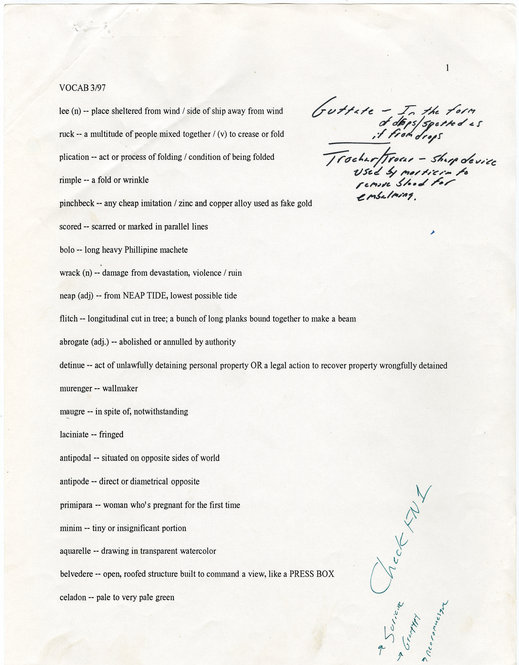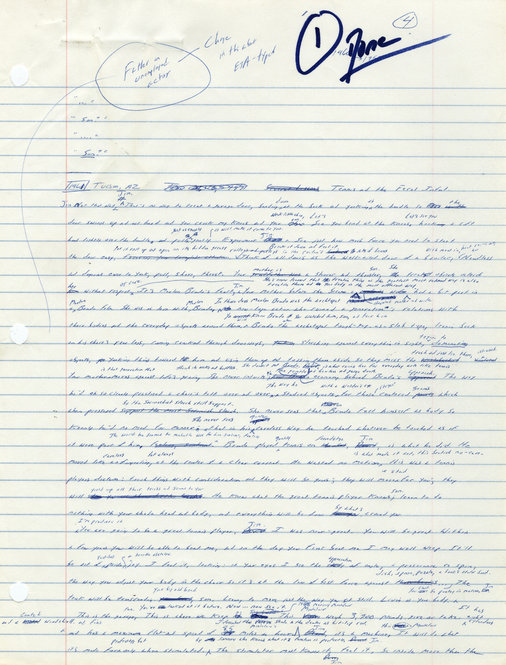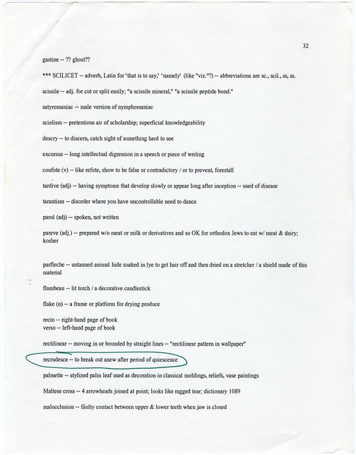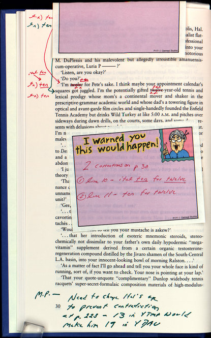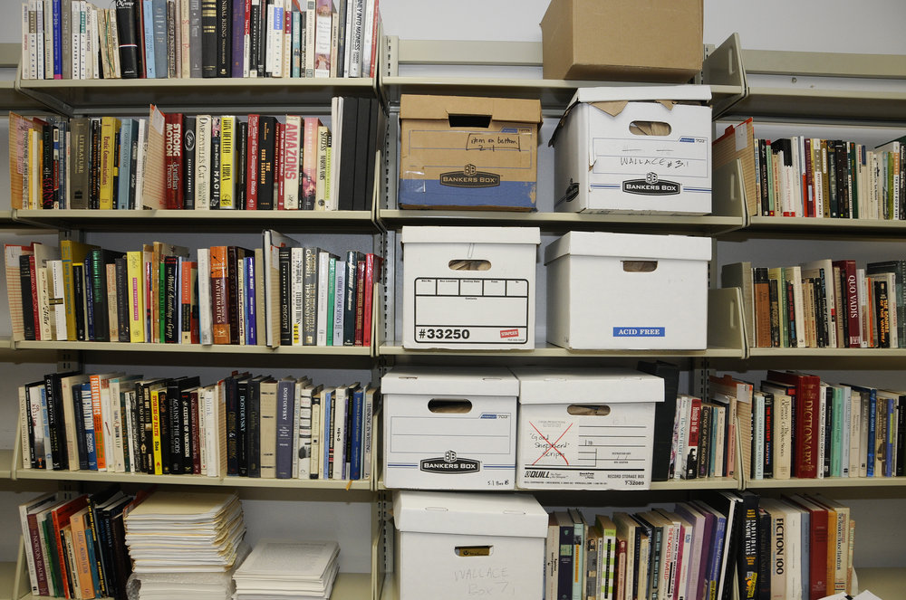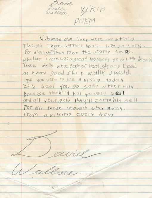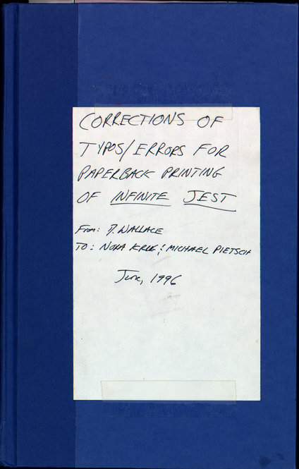 March 23, 2010, Filed Under: Authors, Books + ManuscriptsMaterials from David Foster Wallace collection Please click the thumbnails to view larger images. 456_infinite_j_300dpi.jpg First pages of a handwritten draft of “Infinite Jest” by David Foster Wallace. First pages of a handwritten draft of “Infinite Jest” by David Foster Wallace. First pages of a handwritten draft of “Infinite Jest” by David Foster Wallace. First pages of a handwritten draft of “Infinite Jest” by Wallace. Letter from Jim Harrison to Wallace, dated late July 2006. The letter was tucked inside a copy of Jim Harrison’s book “Saving Daylight.” First pages of a handwritten draft of “Infinite Jest” by David Foster Wallace. Notes from editor Michael Pietsch to Wallace regarding draft of “Infinite Jest,” dated Dec. 22, 1994. The annotations are Wallace’s. Notes from editor Michael Pietsch to Wallace regarding draft of “Infinite Jest,” dated Dec. 22, 1994. The annotations are Wallace’s. Notes from editor Michael Pietsch to Wallace regarding draft of “Infinite Jest,” dated Dec. 22, 1994. The annotations are Wallace’s. Notes from editor Michael Pietsch to Wallace regarding draft of “Infinite Jest,” dated Dec. 22, 1994. The annotations are Wallace’s. “Viking Poem,” written by David Foster Wallace when he was a child. Early use of his signature as “David Foster Wallace.” Page from Wallace’s “American Heritage Dictionary,” in which he frequently circled or marked words. Page from word list compiled by Wallace. Materials from the Wallace collection, which is currently being processed at the Ransom Center by archivist Stephen Cooper. Photo by Anthony Maddaloni. Books from the Wallace library. Many of the books are heavily annotated in Wallace’s hand. Photo by Anthony Maddaloni. First pages of a handwritten draft of “Infinite Jest” by Wallace. On page 30 of a bound copy of “Corrections of Typos/Errors for Paperback Printing of Infinite Jest,” Wallace corrects the age of one of the characters in the book. Page from word list compiled by David Foster Wallace.