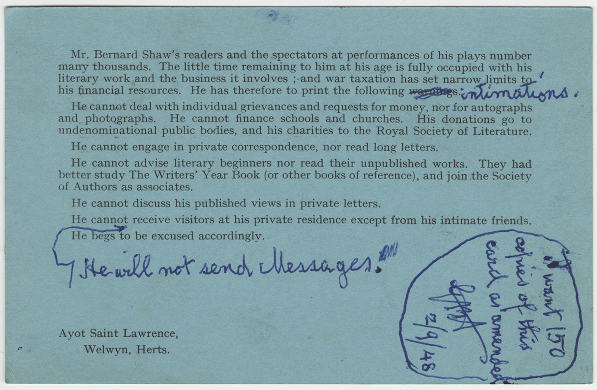 April 13, 2010, Filed Under: Research + TeachingA Small Gem of Negativity: The Decline Postcard Timothy Ferris has recently blogged about Edmund Wilson’s “decline letter,” a form postcard listing all of the things the crotchety literary critic refused to do: read manuscripts, advise authors, address meetings, donate and inscribe books—the list goes on and on. The same postcard may be found in the Ransom Center’s collections, and on our copy Wilson has checked “WRITE ARTICLES OR BOOKS TO ORDER” and added “I have nothing interesting to say about Pound and haven’t been influenced by him.” I have “collected” such items in the Center’s collections for several years without a pigeonhole (the catalogers like to call them “genre headings”) to throw them into, but now I do. The term “decline letter” has a certain rightness and precision about it. In my view, a decline letter shouldn’t be confused with a rejection letter (Ferris himself goes on to make this error in his blog). The purpose of a rejection letter is to turn down book manuscripts or deflate one’s aspirations of attending an Ivy League university. A decline letter, on the other hand, is a form letter used to decline all the various impositions on an author’s (or celebrity’s) time. Authors are subjected to many annoying demands from various quarters, but the autograph collector is probably the most feared. In P. G. Wodehouse’s story “The Autograph Hunters,” the esteemed novelist Mr. Montagu Wilson “was notoriously a foe to the autograph-hunter. His curt, type-written replies (signed by a secretary) had damped the ardour of scores of brave men and—more or less—fair women.” Mr. Wilson could have employed a decline letter or postcard, sparing his secretary many hours of work. Most of the examples of the genre I have seen in the Center’s manuscript collections are actually postcards. A printed postcard answer to an appeal is, by its very nature, a putdown even more offhanded than a form letter. The George Bernard Shaw collection contains a whole folder of these postcards, many of them with autograph revisions. Because of his fame and strong views on all topics, the playwright was constantly solicited by journalists and fans and had an entire repertoire of brightly-colored decline postcards. A form postcard on vegetarianism, though not a decline card, carries a handwritten addition to the printer: “Any color except pink!” Evelyn Waugh spent most of the later part of his career escaping from London literary life and importunate autograph seekers, aspiring authors, and Americans of all descriptions. Yet the mail still had to be dealt with, and Waugh eventually developed a card carrying this notice: “Mr Evelyn Waugh deeply regrets that he is unable to do what is so kindly proposed.” Even more mild-mannered authors, such as Marianne Moore, could be driven to the use of decline postcards. Moore’s list* includes “recommend editors favorable to verse by children or work bequeathed for publication,” suggesting that she had received more than a few requests along this line. I expect that few contemporary writers use decline postcards; they simply ignore annoying requests or have a form email on file for the same purpose. Too bad—at its best the decline postcard is a small gem of negativity. *This example is from an entry in a dealer catalog. Postcard from George Bernard Shaw collection with Shaw’s annotations. Postcard from George Bernard Shaw collection.