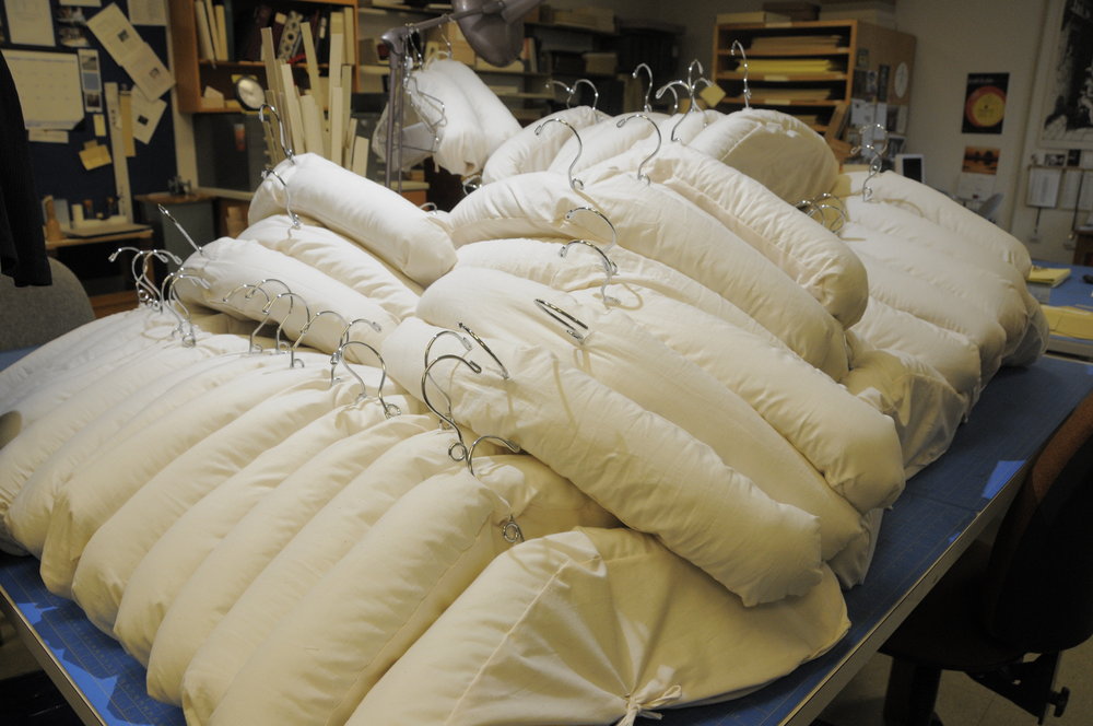 May 11, 2010, Filed Under: Conservation, FilmNo wire hangers: Costumes in Robert De Niro collection receive a set of custom padded hangers In a scene from the 1995 film Heat, Robert De Niro storms into Ashley Judd’s hotel room, grills her for answers, and knocks a line of wire hangers off the rack. According to Ashley Judd, detail-oriented director Michael Mann chose those particular metal hangers for just the right visual and sound effect. The Ransom Center also carefully selected hangers specifically for the costumes of Robert De Niro, whose film archive resides at the Ransom Center. Last October, the Ransom Center’s preservation lab constructed 100 custom-made hangers for heavy coats and jackets in the De Niro collection. “Robert De Niro had a lot of large, heavy coats. For one film, for example, he could have five full-length leather jackets. We had to have something that would be very sturdy and also very good for the textile,” says Apryl Voskamp, Preservation Housings Manager. Before acquiring De Niro’s collection, the Ransom Center had few costumes to house and could afford the space to store the costumes in the ideal environment: lying flat and in the dark. But with thousands of costumes arriving in the De Niro collection, Helen Adair, Associate Curator for Performing Arts, and Jill Morena, Collection Assistant for Costumes and Personal Effects, inspected the costumes and deemed some costumes appropriate for hanging storage, including many of the jackets. “It takes less space to store things hanging,” says conservator Mary Baughman. “Things like the leather jackets are pretty tough as long as they’re out of the light.” The challenge was to find or make padded hangers appropriate for De Niro’s jackets. “We didn’t have any hangers here that would work,” Baughman says. “Some of the De Niro costumes are pretty heavy, and the hangers we had here were too flimsy. And we couldn’t find a commercially made hanger that would work. There are a lot of archival quality hangers out there for your wedding dress, but for a big, heavy leather coat, not so much.” The range of costumes worn by De Niro’s varied film personae created some unique circumstances for the team. For example, a large, heavy canvas coat worn by the swashbuckling, cross-dressing pirate Captain Shakespeare in Stardust (2007) was treated by the wardrobe department to look weathered and beaten by the elements. This distinctive costume “got an even more macho hanger,” according to Baughman. Other costumes selected to hang include full-length jumpsuits worn by De Niro’s jewel thief in The Score (2001), as well as the jumpsuits worn by his stunt double. The suits bear burn holes from the blowtorch used by De Niro’s character to break open a safe. The preservation team also decided not to hang certain jackets. For example, De Niro’s characters get shot, burned, or injured in many of his films, and Voskamp and Baughman were worried about hanging bloody jackets, many of them still sticky. “I learned that fake blood is an industry secret,” Voskamp says. “Studios don’t want to divulge their recipe because they think it’s the best. It would be helpful to know what’s in the fake blood to know if it will damage other items, but that’s very difficult to figure out. So we decided to isolate these costumes and house them lying flat to make sure the fake blood doesn’t migrate onto other materials.” Baughman is the mastermind behind the design. She searched for just the right hanger, eventually choosing a sturdy long-necked stainless steel hanger to serve as the main frame. The next step was to construct shoulder supports to cover the metal hanger which would prevent the metal from distorting the garment’s original shape. “We didn’t want to have this sharp edged metal hanger up against the cloth of the garment. It would’ve left a mark in the garment. After a few years, the fibers will break along those creases,” Baughman says. Baughman designed the shoulder supports out of lignin-free board. For decades, “lig-free” board has been used to create a variety of custom archival containers at the Ransom Center. Each piece of lignin-free board had to be cut, creased, and tied with twill tape to simulate the shape of human shoulders. The final component of the hanger was a padded cloth covering to go over the shoulder support. Each cloth covering has three parts: two cloth sides and a long cloth tube filled with polyester batting. It took a team of seven—including Voskamp, Baughman, University of Texas work-study student Liz Phan, and four volunteers—one month to complete the project, spending the entire month exclusively making hangers. Each hanger took an hour and a half to construct for a total of 262 hours. For the Ransom Center’s preservation team, it’s worth getting hung up on the details. Please click the thumbnails to view larger images. Stacks of creased board and cloth pieces ready to be sewn, a pile of completed padded cloth covers. Head of the preservation lab Apryl Voskamp, and work-study student Liz Phan consult. Photo by Mary Baughman. Card templates are used to guide the cloth cutting on a table protected with self-healing cutting mats. A rotary cutter with a zigzag blade was used to cut the cloth. Photo by Mary Baughman. Lignin-free card is creased to form the shape of shoulders, holes are punched for the twill tape ties, the top of the card is reinforced with linen hinge tape, and a slot is cut for the hanger hook. Photo by Mary Baughman. The inside of the card support showing the hanger and the twill tape before the twill tape is cinched up and tied. Photo by Mary Baughman. Volunteer Lindsay Barras at the sewing machine. Other volunteers who contributed their help were Katie Andusko, Katy David, Darby Hillman, and Whitney Hughes. Photo by Mary Baughman. One-half inch thick polyester batting, folded and rolled to create padding for the shoulders. The