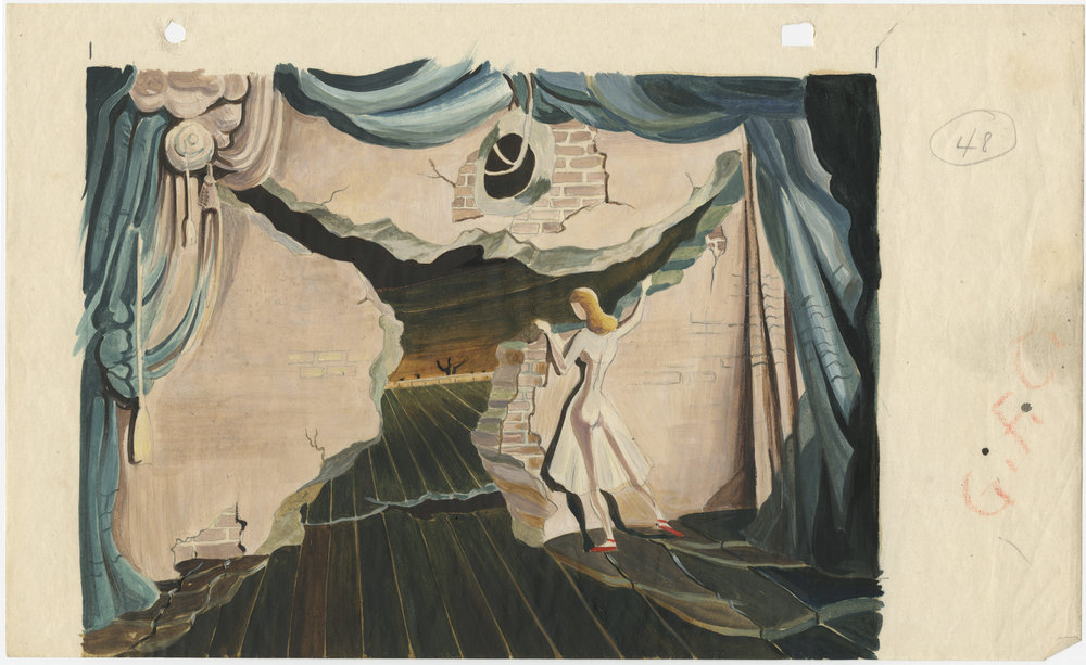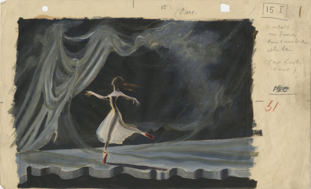 July 30, 2010, Filed Under: FilmSee designs for ‘The Red Shoes’ and view a restored version of the film The Alamo Drafthouse Cinema will be screening a restored version of The Red Shoes (1948) on Thursday, August 5. Through August 1, visitors to the Making Movies exhibition can view Hein Heckroth’s storyboards for The Red Shoes and a “picture script” from the movie. Hein Heckroth was a Surrealist painter and set designer who lived and worked in Germany in the years after World War I. Building on the then-radical theories of Edward Gordon Craig and Adolphe Appia, he earned an international reputation working with the Kurt Jooss dance company creating avant-garde sets and costumes for their productions. In 1933, Heckroth left Germany when he was blacklisted by the Nazis for refusing to leave his Jewish wife, the artist Ada Maier. They moved to England where Heckroth designed operas for Kurt Weill, Carl Ebert, and others, and continued working with the Jooss dance company, which had also moved to England. In 1943, production designer Vincent Korda saw Heckroth’s design work in a stage production of War and Peace and hired him to work on Gabriel Pascal’s film Caesar and Cleopatra (1945). Soon he was recruited by Alfred Junge, the head designer for The Archers, the production unit founded by Michael Powell and Emeric Pressburger. There he designed costumes for A Matter of Life and Death (1947) and Black Narcissus (1949). Given his experience with avant-garde theater and designing for dance, he was the natural choice for production designer for The Red Shoes. Powell and Pressburger gave him enormous freedom to experiment, and he created beautiful surreal sets and costumes with materials such as chiffon, gauze, and cellophane. His stunning designs for The Red Shoes won him an Oscar for color art direction in 1948. These two designs and the “picture script” for the dance sequence in The Red Shoes come from the collection of Heckroth’s colleague Edward Carrick, another important production designer in England at the time. Please click on the thumbnails below to view full-size images. Storyboard #2 of dancer in “The Red Shoes.” Storyboard #1 (with wall) from “The Red Shoes.” “Picture Script” from “The Red Shoes.” “Picture Script” from “The Red Shoes.” “Picture Script” from “The Red Shoes.”