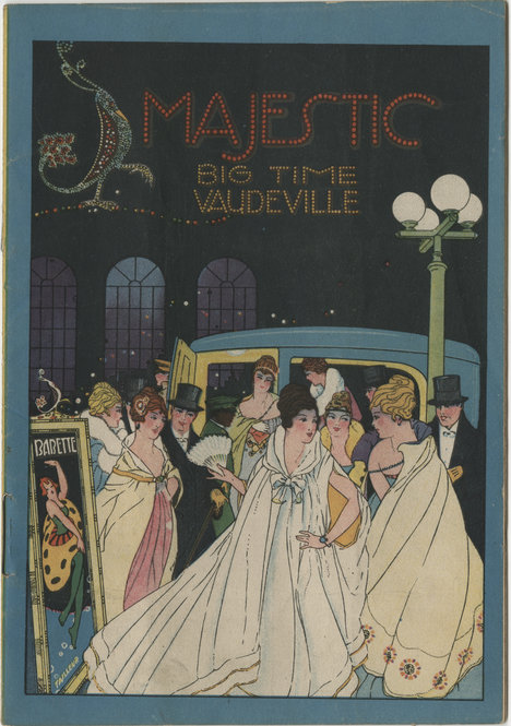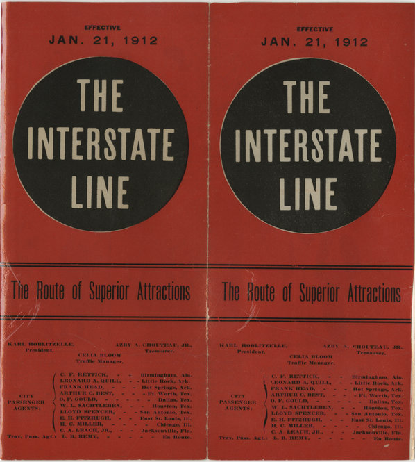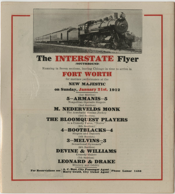 September 2, 2010, Filed Under: Research + Teaching, Theatre + Performing ArtsScholar explores vaudeville circuits and regional architecture Paula Lupkin, a professor in the American Culture Studies Program at Washington University in St. Louis, recently spent time as a fellow working in the Hoblitzelle-Interstate collection at the Ransom Center. Her research yielded some surprises and insights into the regional vaudeville circuits in the Southwest, which she shares here. When I arrived at the Ransom Center to take up the Mayer Filmscript Fellowship, my intention was simple: to learn as much as possible about the design and use of the fabulous vaudeville theaters designed by architect John Eberson for the Interstate Amusement Company in Texas. These theaters are an important component in my study of regional architecture in the Southwest at the turn of the twentieth century. Many of them are no longer extant, and it was essential to find period photography and documentation of the buildings themselves. The Center is home to the Hoblitzelle-Interstate collection, which has the most complete photographic record of the theaters, as well as accounts of their planning, construction, programming, and management. Right away I found wonderful pictures, theater programs, and company records that suggested how and why the buildings looked as they did. Through these materials I learned a great deal about these fantastical structures, which included themed interiors, starlit skies, luxurious lounges, and even child care centers. To an architectural historian, these archival sources were rich indeed, but they were not the greatest treasure I found during my fellowship month. After about a week, I came across something that transformed and enriched the way I think about those theaters: a 1912 program for Interstate’s southwestern vaudeville circuit. Of course I knew about circuits before I saw this pamphlet. From the first day in the archives, the company’s business records made it clear that the theater buildings were only one part of Interstate’s system of delivering talent to the public in a profitable and efficient way. The company assembled talent into programs of entertainment, known as “bills,” and then sent the acts on a railroad journey from theater to theater. Some were the elaborate venues designed by Eberson, but equally important were the smaller towns and more modest opera houses that allowed performers to travel profitably the long distances between places in this region, with regularly spaced “jumps” between gigs. The circuit was an experience designed from a business perspective to make efficient use of the existing rail lines to offer as many shows as possible on consecutive nights. With this basic knowledge of the vaudeville circuit, I began to see that Interstate’s theaters were more than a regional group of buildings linked by a common architect and ownership; they served as a series of nodes within an entertainment transportation system. Interstate’s building activity was not restricted to theaters; the company was constructing patterns and systems of movement along the Illinois Central, the Frisco, the KATY, and the Missouri Pacific Railroads. The 1912 pamphlet I found crystallized and confirmed this rereading of the history of theatrical architecture. This clever piece of ephemera presented Interstate and its southwestern vaudeville circuit in the guise of a railroad system. The red cover introduced “The Interstate Line” as “the Route of Superior Attractions.” As was typical in railway literature of the time, the name of the president and local agents of both the national and local officials of the company are listed in the brochure. The “railway” president was the company president, Karl Hoblitzelle. The “traffic manager” is listed as Cecilia Bloom, the company’s booking agent. For each city on the circuit, the local theater manager is listed as the “city passenger agent.” The week’s entertainment bill is presented as a special train, “The Interstate Flyer,” which leaves from Chicago and runs in seven sections (acts) to Fort Worth, and then on to the rest of the cities on the circuit. With this pamphlet in hand, as it became clear to me that the Interstate Company envisioned itself not as a series of theaters, but an infrastructural system and a space-time experience that united performers and audiences across the southwest. Actors traversed the territory in a series of rail cars, dressing rooms, hotels, and restaurants, playing to urban audiences in theaters in Little Rock, Oklahoma City, Fort Worth, Dallas, Austin, San Antonio, Galveston, and Birmingham. The performers and audiences were linked together, defining a regional entertainment landscape. My newfound understanding of the theaters as part of the railroad-based geography of the vaudeville circuit fits very well into my developing project, “The Great Southwest: Trade, Territory, and Regional Architecture.” Most studies of regional architecture focus on formal and material similarities between buildings in a particular location. My project moves away from style and suggests instead that regional architectural patterns are formed by banking, commerce, and transportation networks. Looking at the triangular strip of land between St. Louis and Texas in the late nineteenth and early twentieth centuries, I map financial and architectural connections between buildings and sites along the conduits of the railway lines. What I found in the Hoblitzelle-Interstate collection helped me understand that these buildings are regional not on the basis of their appearance, but as elements of a regional entertainment system: like beads strung along a necklace. The “Interstate Line” brochure encapsulated that in a series of images, confirming that my own way of understanding the theaters was shared by the company itself, and no doubt by the vaudeville performers themselves, whose lives