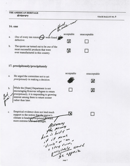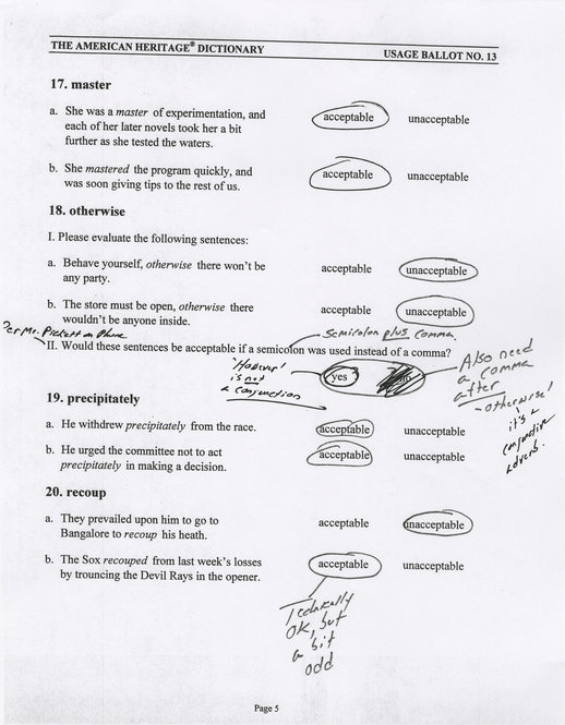 September 14, 2010, Filed Under: Books + ManuscriptsAdditional David Foster Wallace materials at the Ransom Center The David Foster Wallace papers have been cataloged and are now available for study in the Ransom Center’s reading room. Since last March when the Center announced its acquisition of the papers, a few small collections have arrived that complement the archive acquired from Wallace’s Estate. Just weeks after we announced the acquisition, the Ransom Center was contacted by Steve Kleinedler, supervising editor of American Heritage Dictionary (AHD). Wallace was a member of the AHD usage panel, a group of individuals AHD consulted about issues related to usage and grammar. Each year, AHD sends a survey or “usage ballot” of questions to its board members—asking, for example, the acceptable use of specific words—and the responses influence how AHD defines appropriate usage in its dictionaries. Wallace, whose facility with language was exceptional, was enthusiastic about serving on the AHD usage panel, and his survey responses demonstrate how seriously he took his role. Though most of the questions were designed so that they could be answered with a mere check mark, the six usage ballots that Wallace completed are covered with his comments and questions. AHD sent the Ransom Center copies of David Foster Wallace’s usage ballots, and a few sample pages can be seen in the slideshow above. Within days of hearing from AHD about their Wallace materials, the Ransom Center received a call from Jay Jennings, the former editor of Tennis Magazine, who in 1996 commissioned Wallace to write an article about the U.S. Open (published as “Democracy and Commerce at the U.S. Open”). The editor had a file of corrected proofs and correspondence related to the article that he wanted to contribute to the archive. These papers provide a wonderful example of how involved Wallace was in the editorial process. Wallace had warned the editor that he would be a difficult editee, but the papers demonstrate the contrary. Though Wallace’s comments on the proof pages are often assertive, they are equally good-natured, dotted throughout with smiley faces, and oftentimes showing his humor. A sample page can be seen in the above slideshow. Both of these collections were donated to the Ransom Center by individuals who admired Wallace’s work and felt compelled to make a contribution to his archive. This generosity of spirit is characteristic of the enthusiastic and very personal responses the Ransom Center has received from a number of devoted readers of Wallace’s works over the past several months, readers who wanted to give something back to the community in honor of a writer they admired deeply. Please click the thumbnails to view larger images. Page 1 of corrected proof of David Foster Wallace’s 1996 essay on the U.S. Open for “Tennis Magazine.” David Foster Wallace’s “American Heritage Dictionary” usage ballot No. 10, page 6. David Foster Wallace’s “American Heritage Dictionary” usage ballot No. 9, page 7. David Foster Wallace’s “American Heritage Dictionary” usage ballot No. 11, page 2. David Foster Wallace’s “American Heritage Dictionary” usage ballot No. 13, page 5.